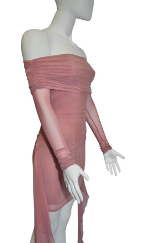 Rochie off-shoulder roz pudrat cu detalii din plasă