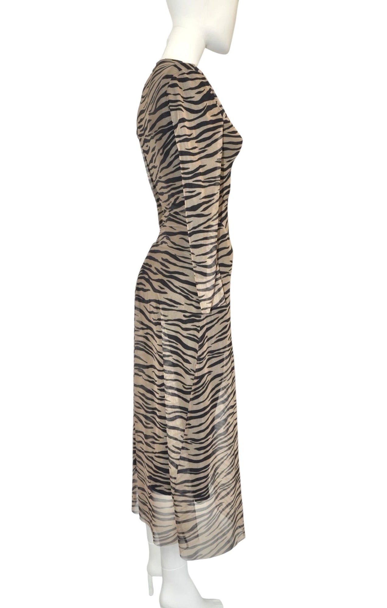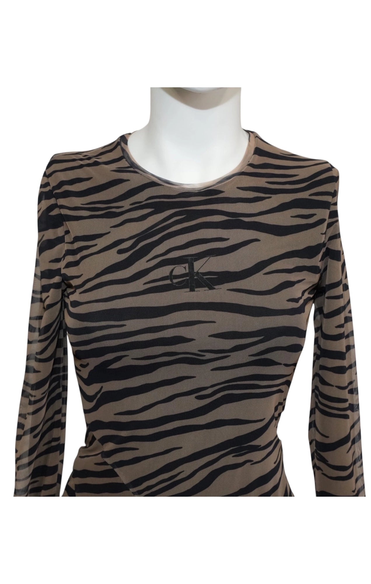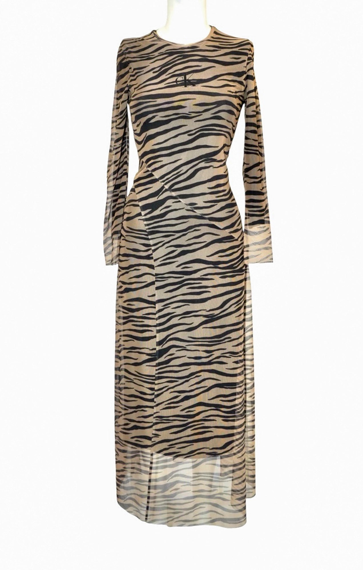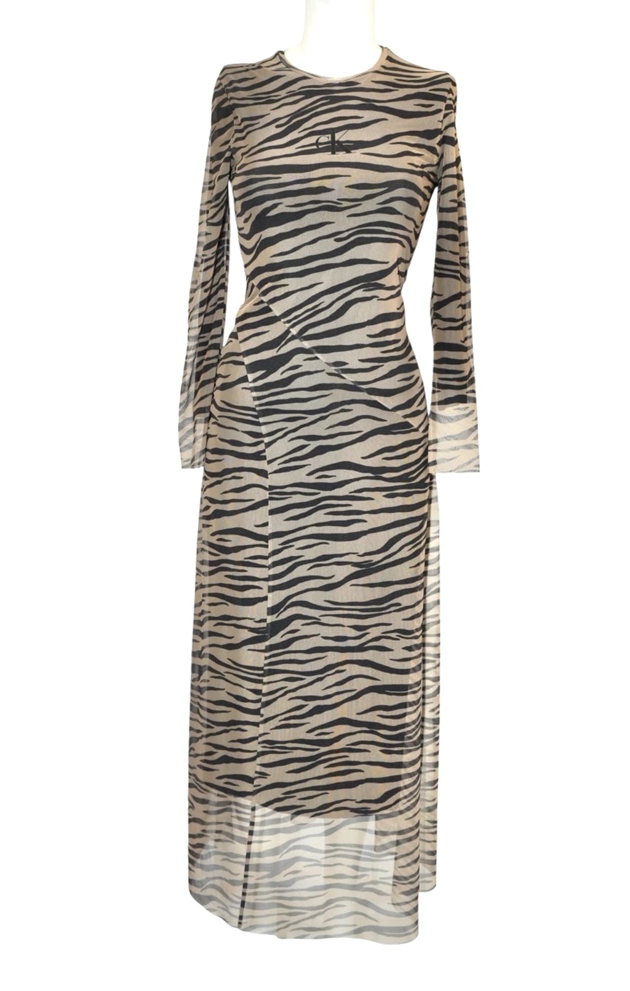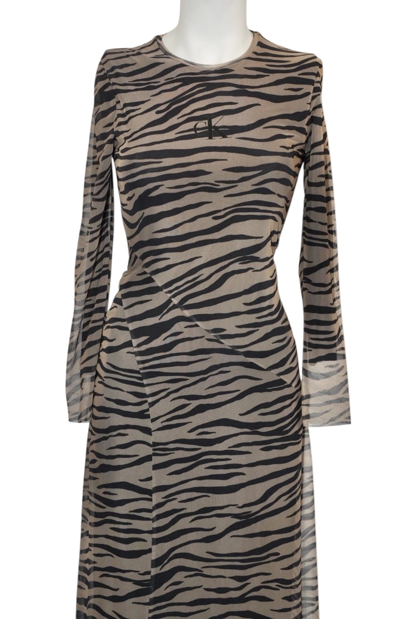 Turn heads with this stunning Calvin Klein zebra print maxi dress in size Small (S). Crafted from lightweight mesh fabric, this dress features a bold animal print design, long sleeves, and a flattering silhouette perfect for both casual chic and evening elegance. Its semi-sheer layering gives it a modern, stylish edge while maintaining comfort and breathability.