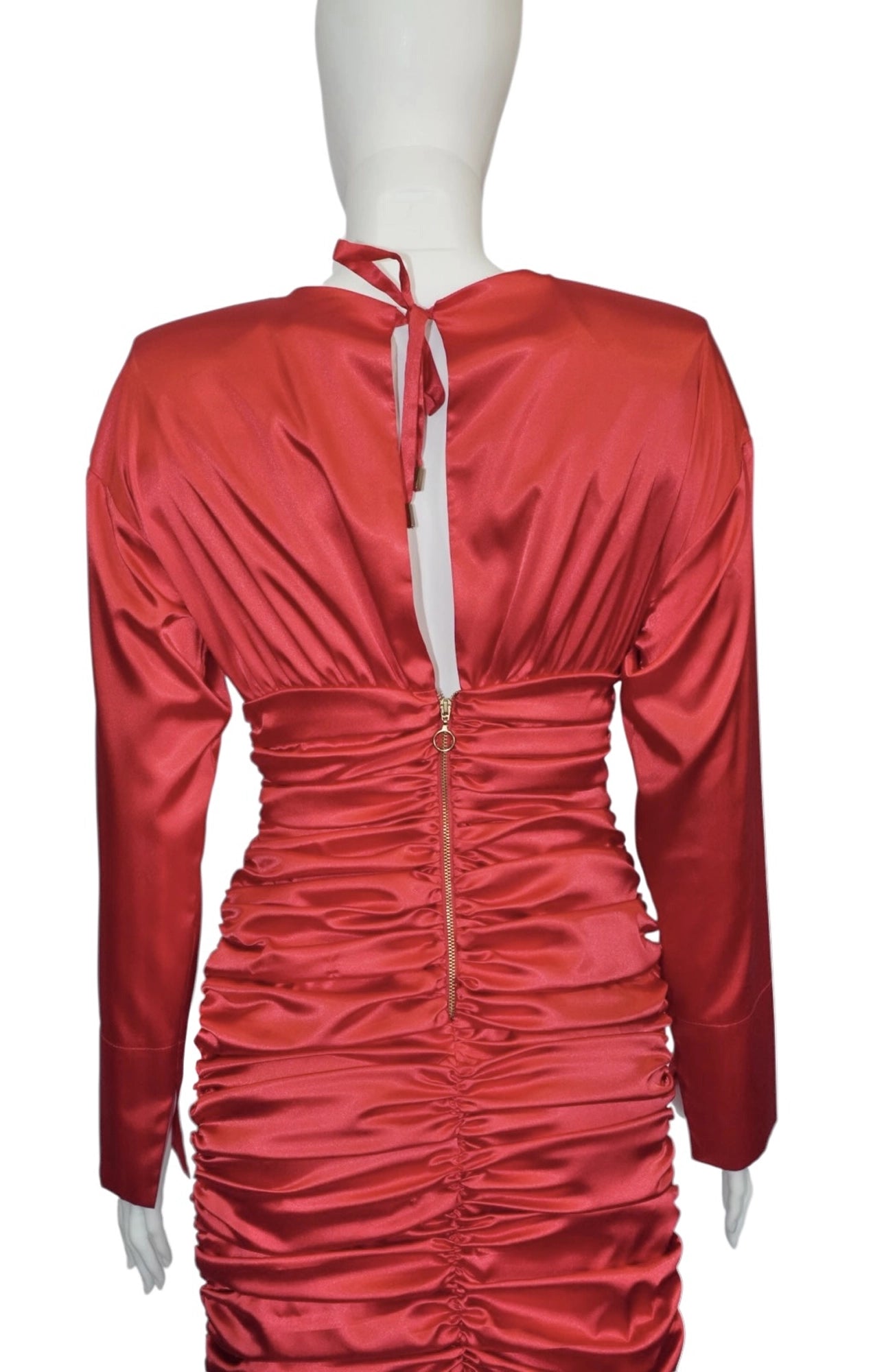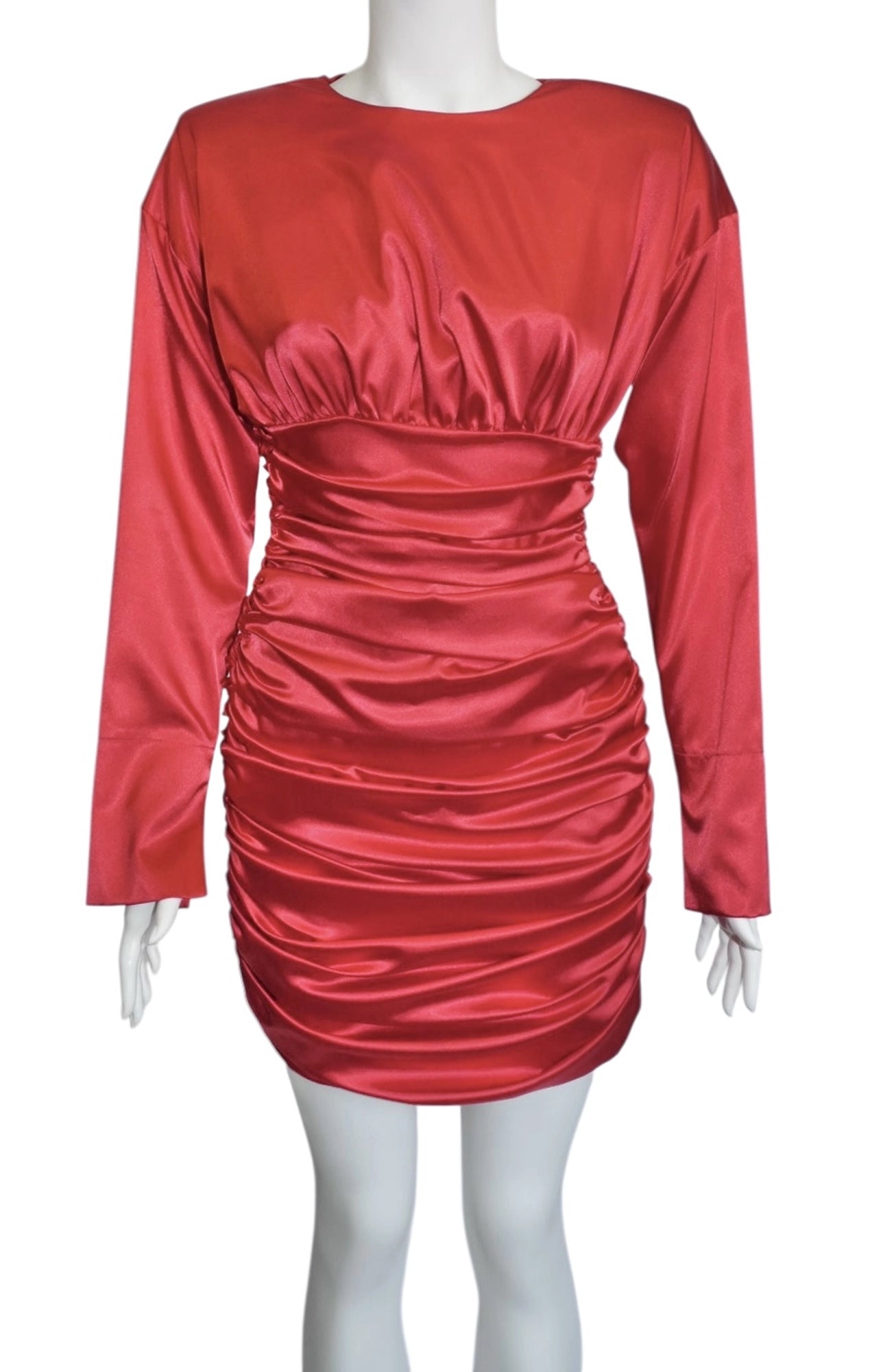 Features: Satin Effect Fabric, Long Sleeves, Round Neckline, Ruched Waist and Skirt