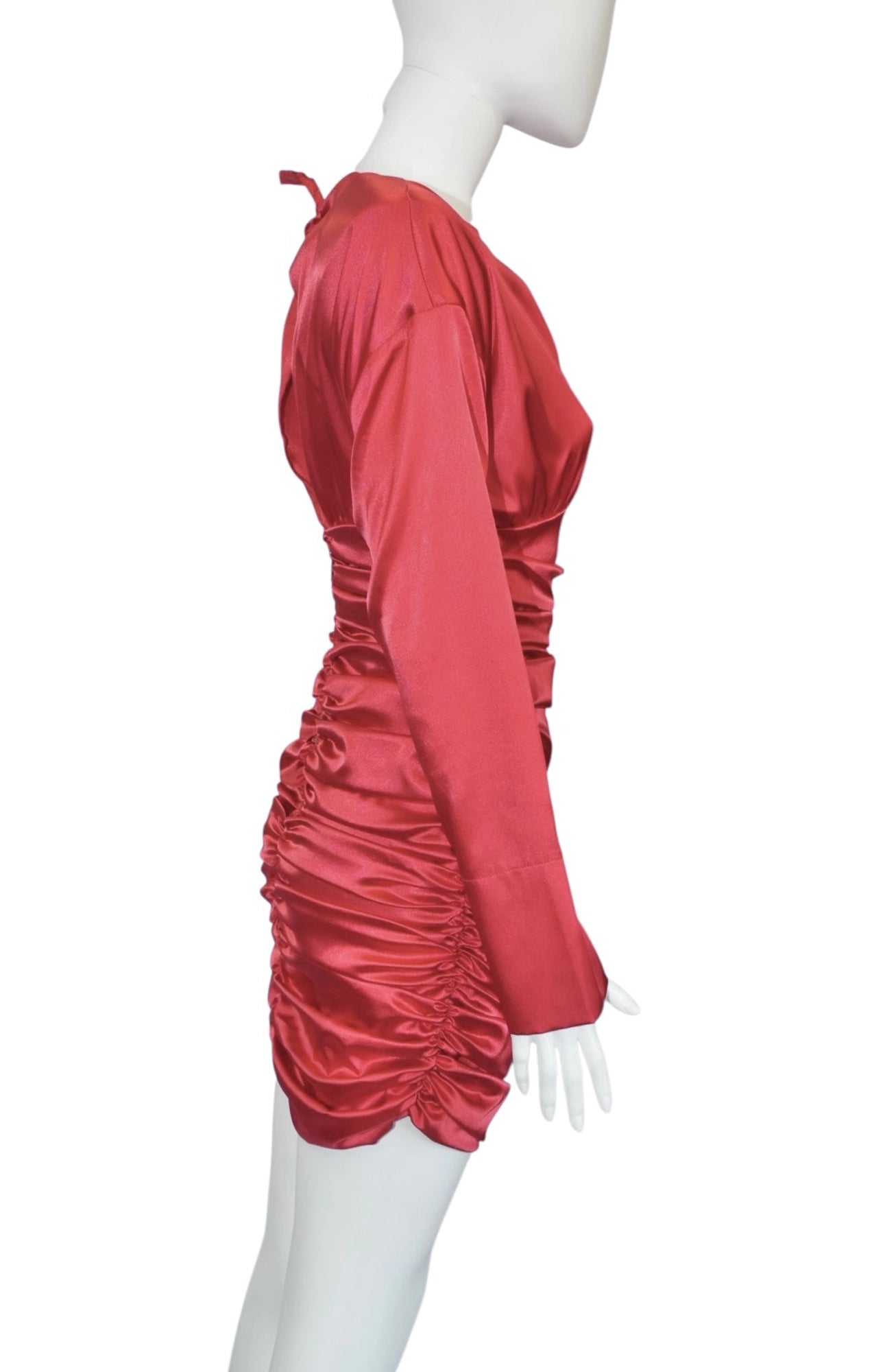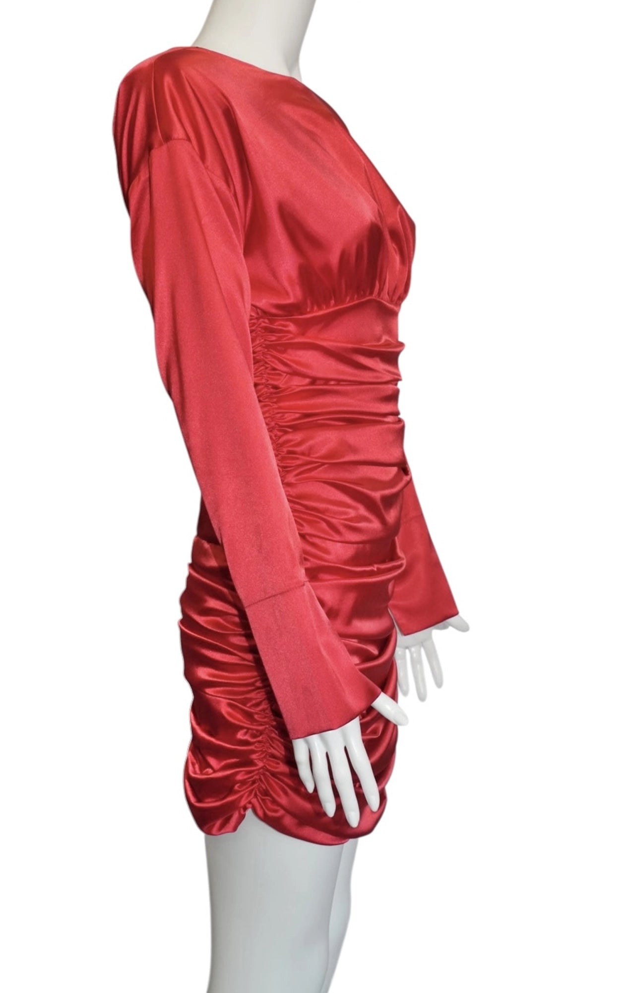 triking and glamorous, this Carolina D mini dress in size S is crafted from a smooth polyester and elastane blend with a satin-like finish. Featuring long sleeves, a round neckline, and ruched detailing along the waist and skirt, it creates a flattering and sophisticated silhouette. The bold red shade makes it a perfect statement piece for evening events or special occasions.