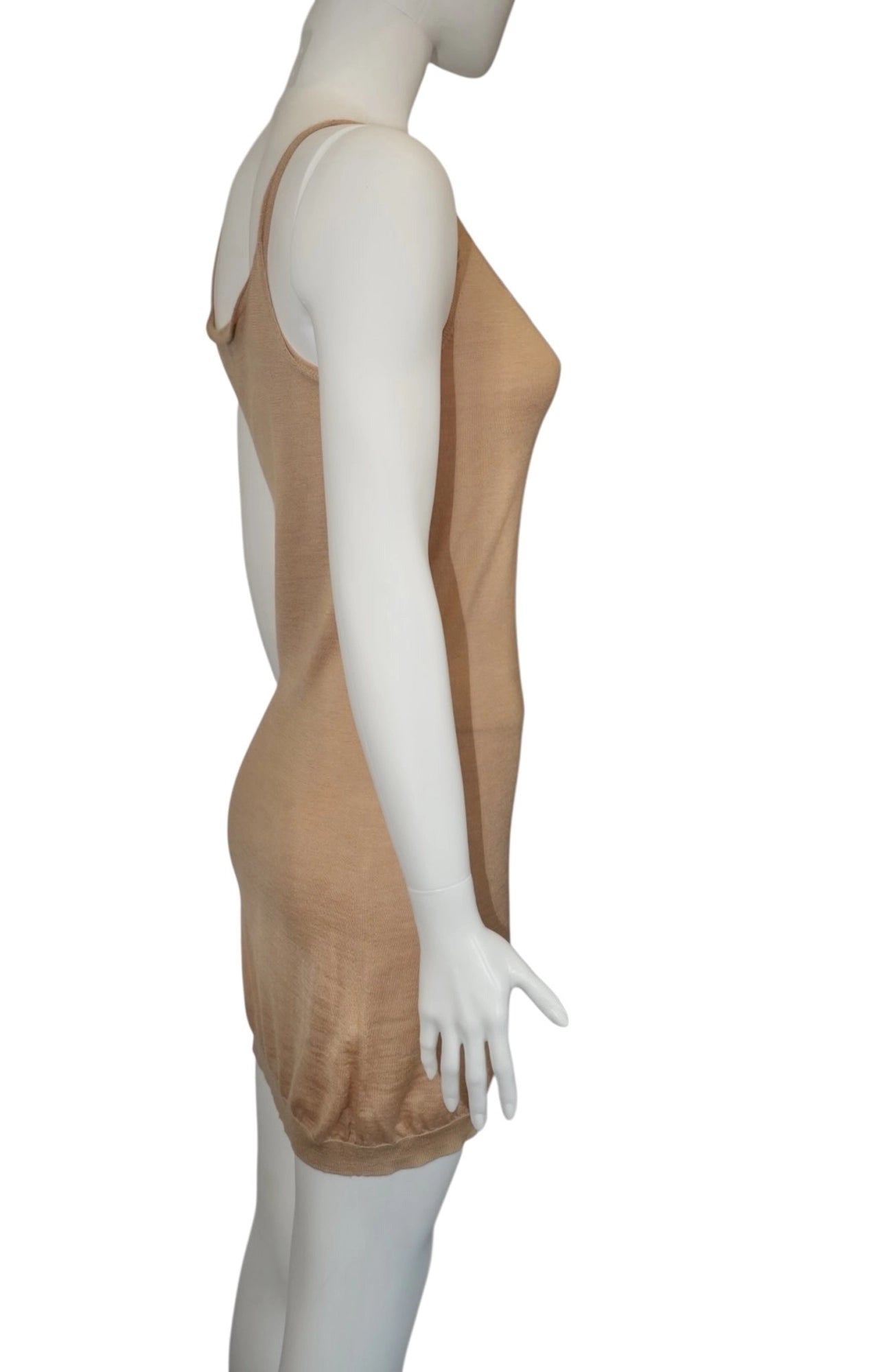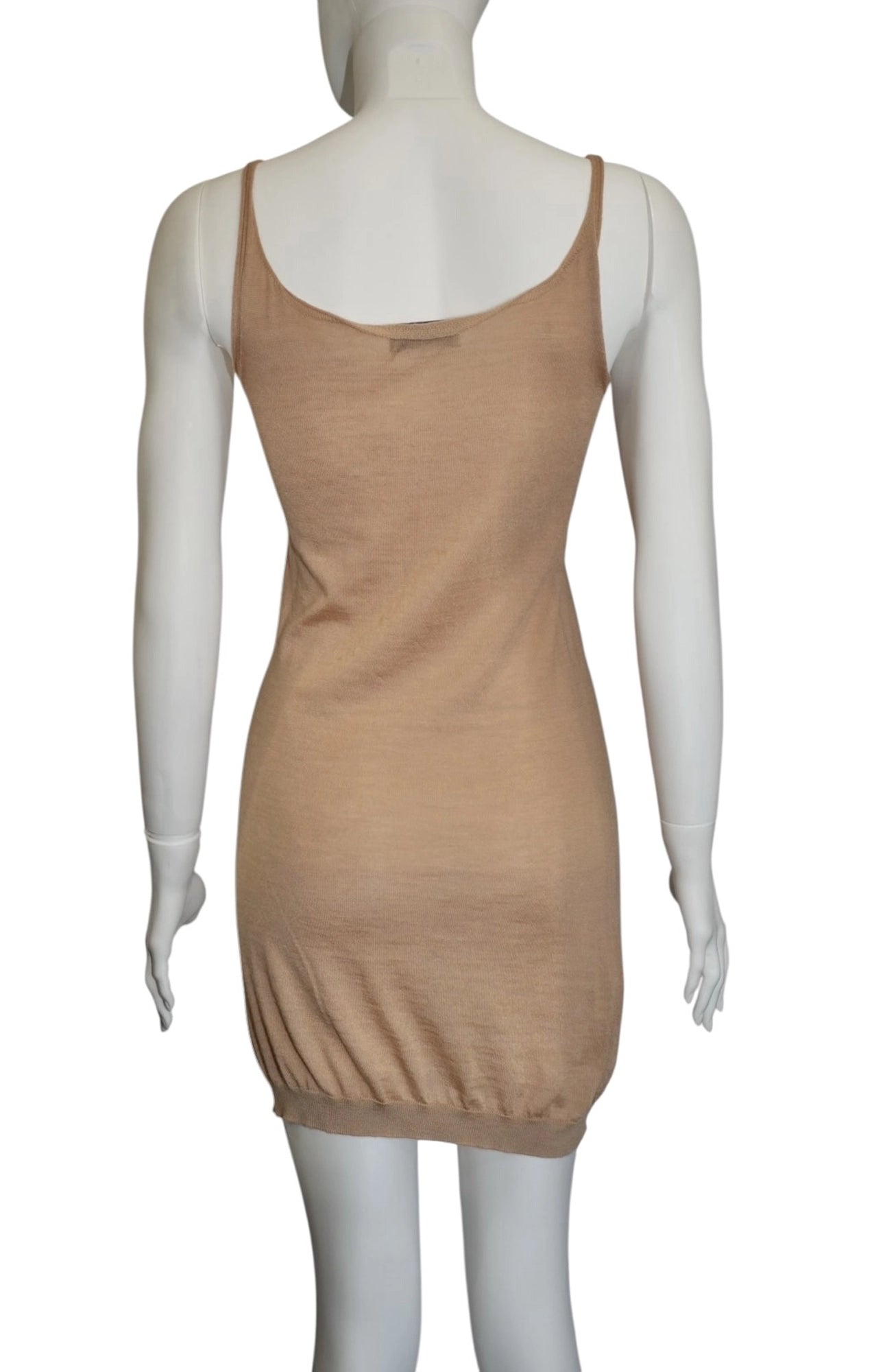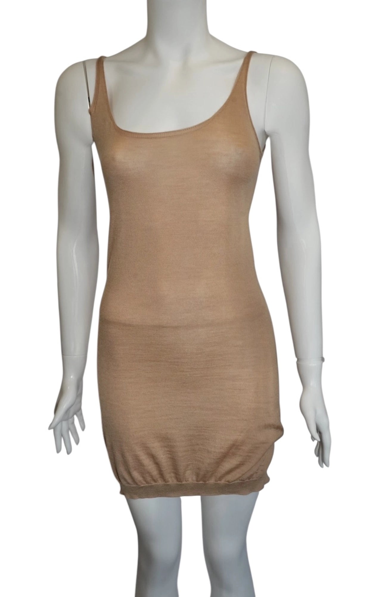 Luxurious and minimal, this Falconeri sleeveless mini dress in size 36 is crafted from soft and lightweight cashmere. Designed in a neutral beige tone, it offers timeless elegance with a modern twist. Featuring thin shoulder straps, a scoop neckline, and a subtly fitted silhouette with gathered hem detail, it combines comfort with refined style. Ideal for layering or wearing on its own, this piece transitions effortlessly from casual chic to sophisticated evening looks.