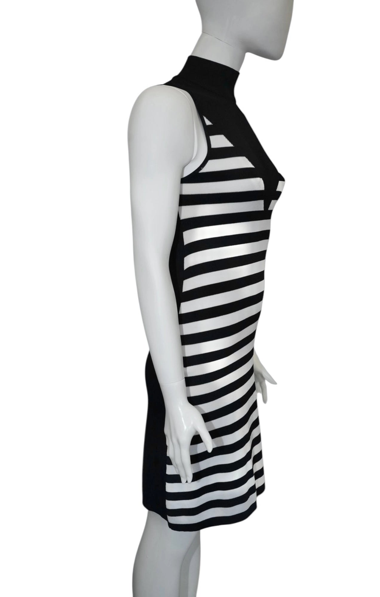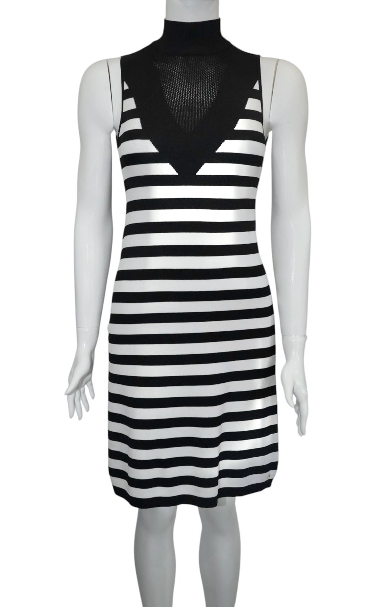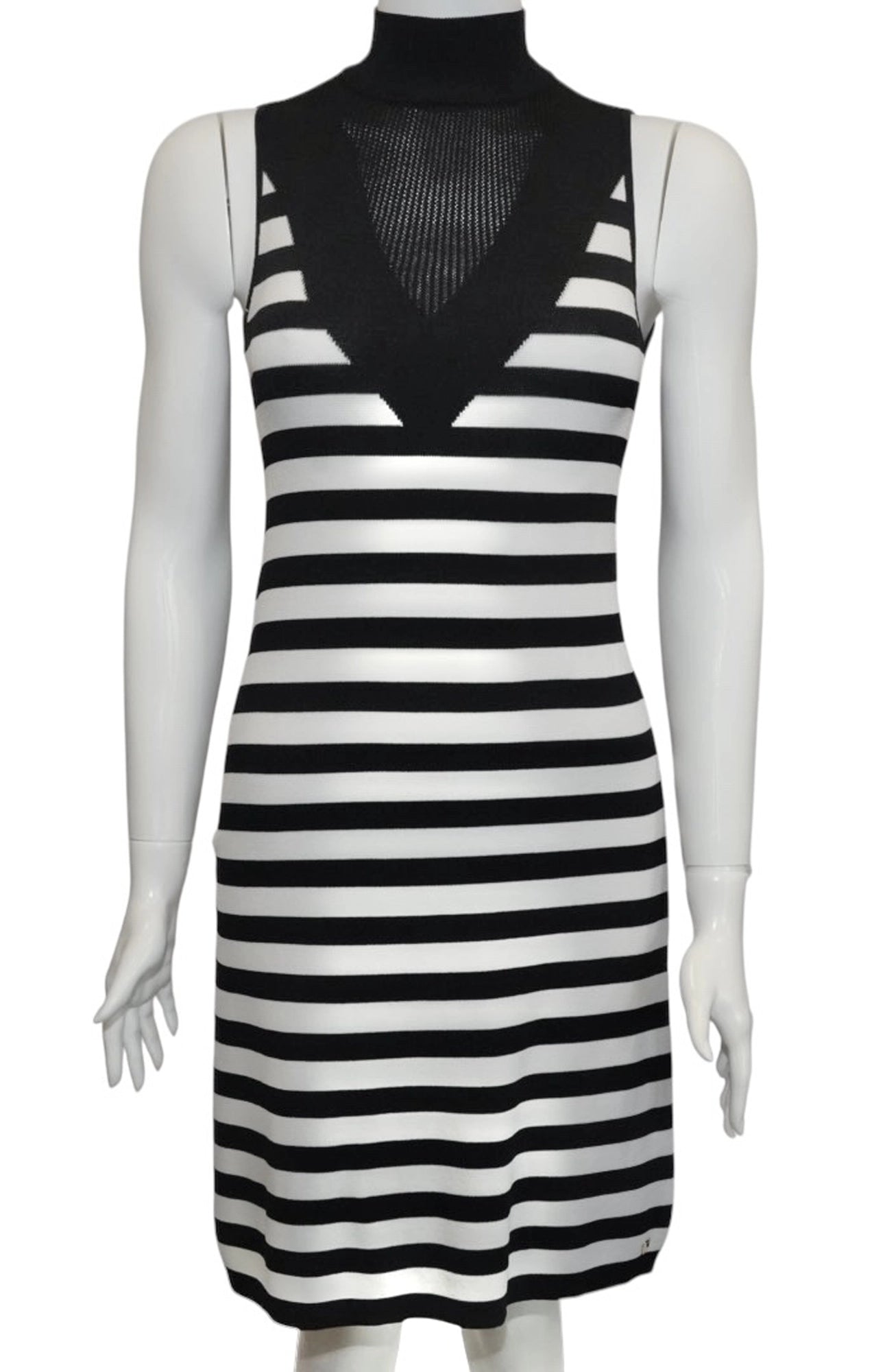 Modern and chic, this Guess dress in size S features a striking black-and-white horizontal stripe pattern with a sleek silhouette. The sleeveless cut is paired with a high neckline and mesh V-insert detail for a touch of allure. Crafted from a soft and stretchy viscose-polyamide blend, it offers both comfort and style, making it a versatile piece for day-to-night wear.