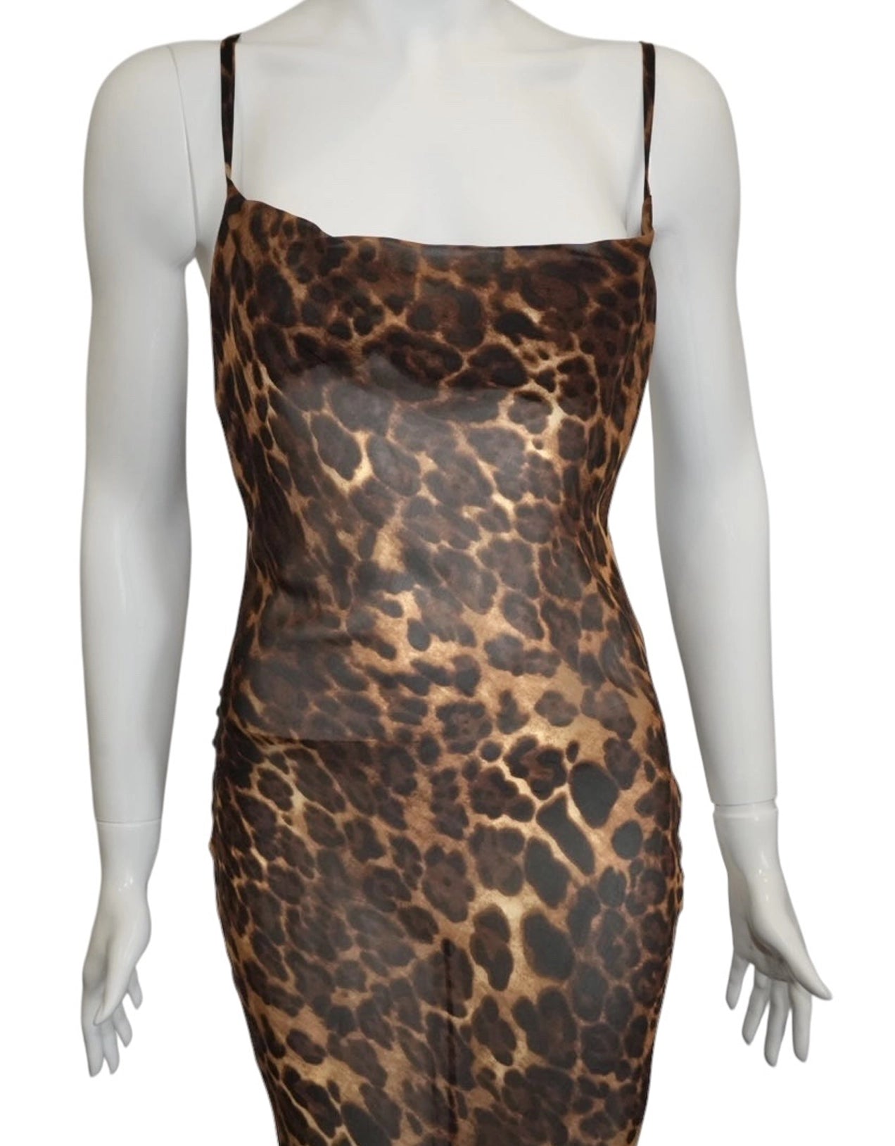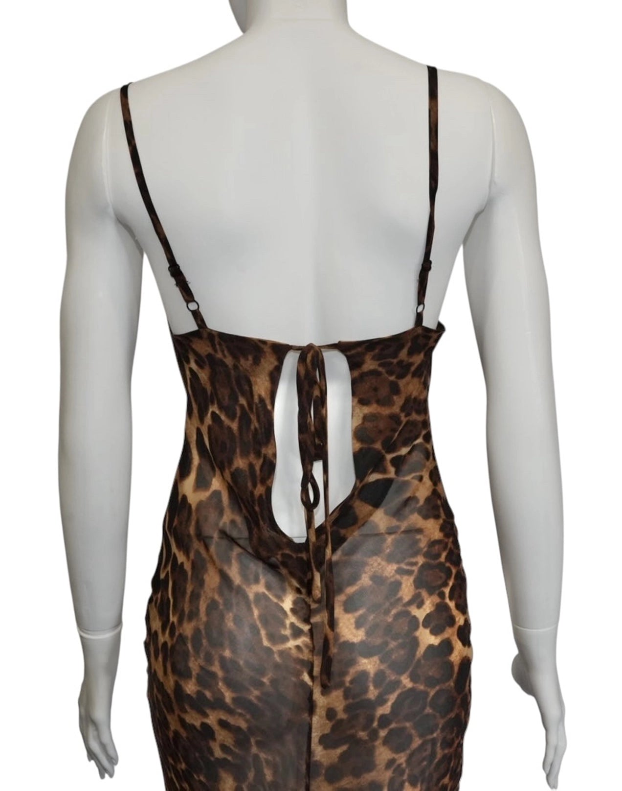 This dress is a versatile statement piece, perfect for pairing with strappy heels and bold jewelry for a glamorous evening appearance, or styled with a leather jacket and boots for a chic, edgy look. Its timeless leopard print ensures it will remain a standout in any fashion-forward wardrobe.
