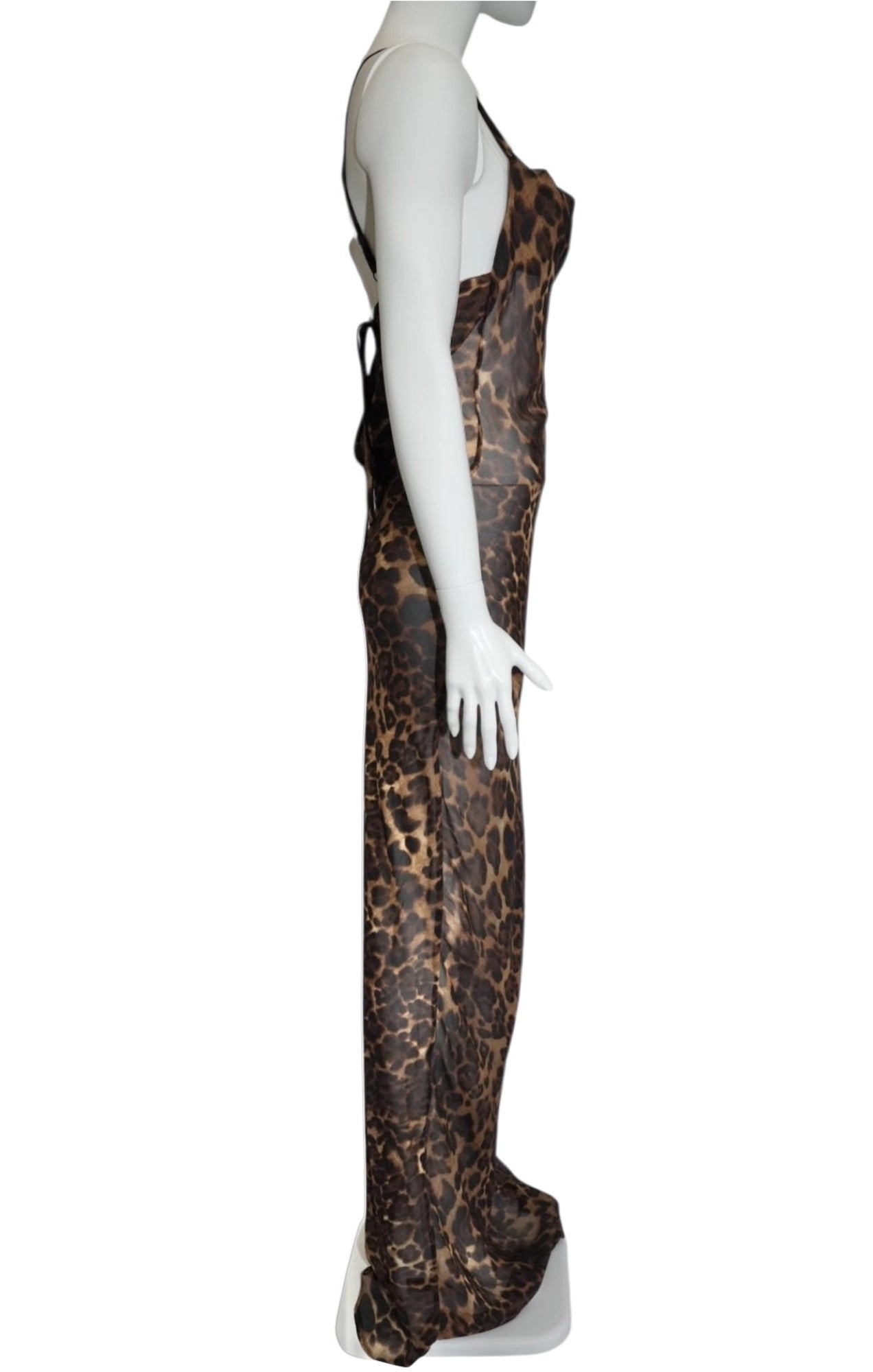 A bold and captivating maxi dress with a sleek leopard print design, crafted from lightweight polyester. Designed in size S, it features thin spaghetti straps, a straight neckline, and a body-skimming silhouette that elegantly flows into a long hemline. The fabric’s subtle sheen enhances the wild animal print, making this dress a striking choice for both evening outings and statement daytime looks.