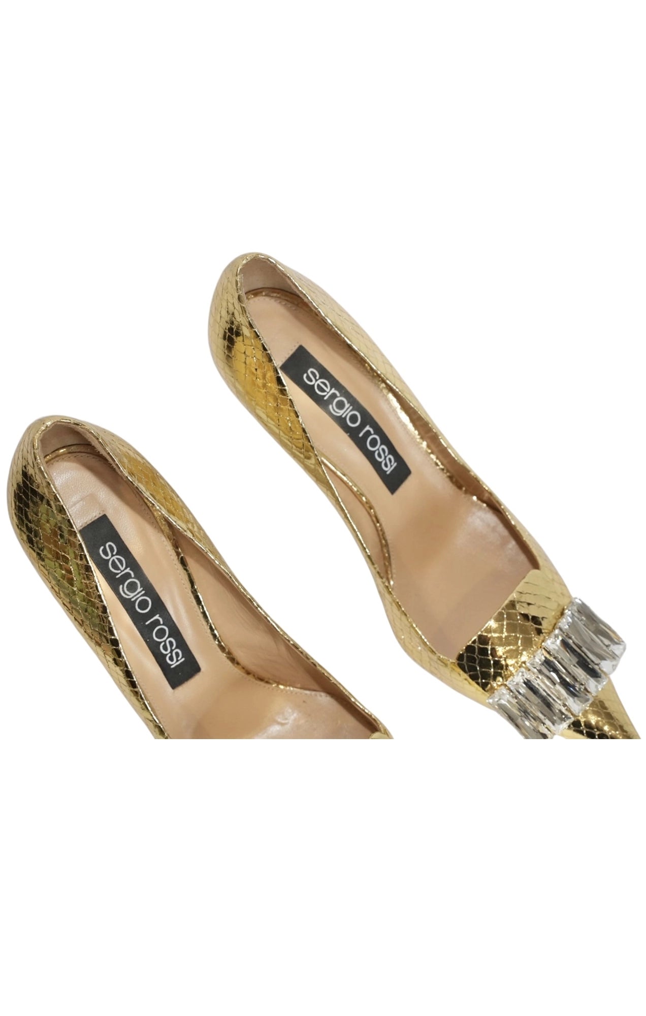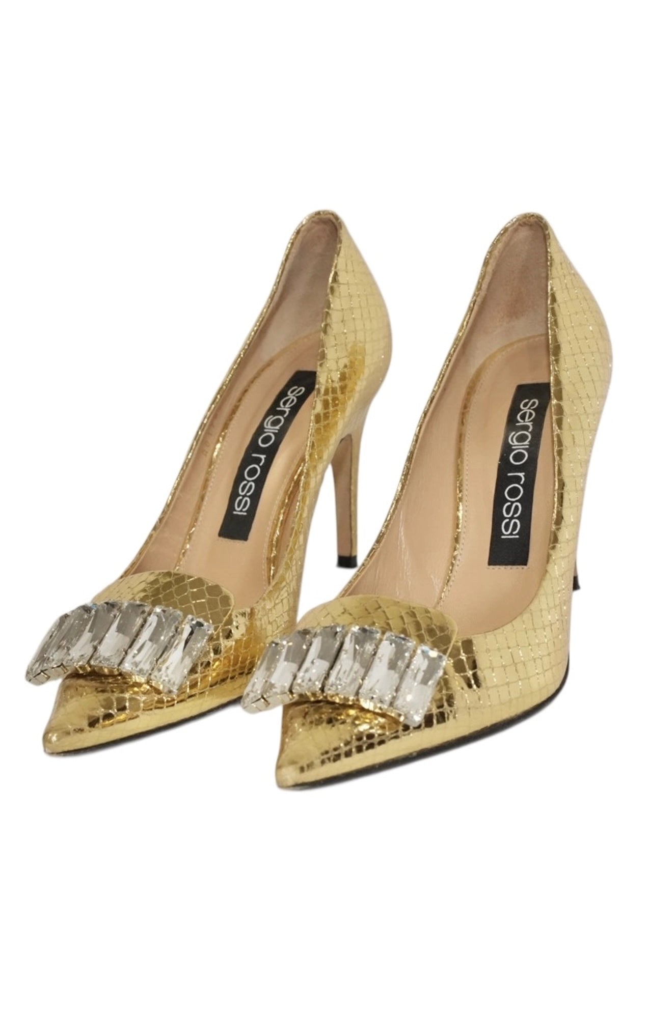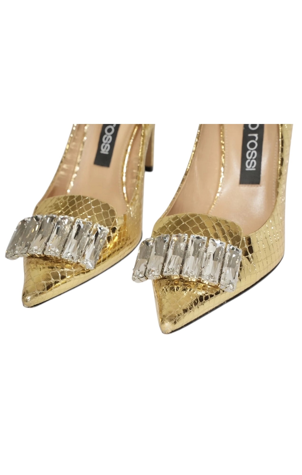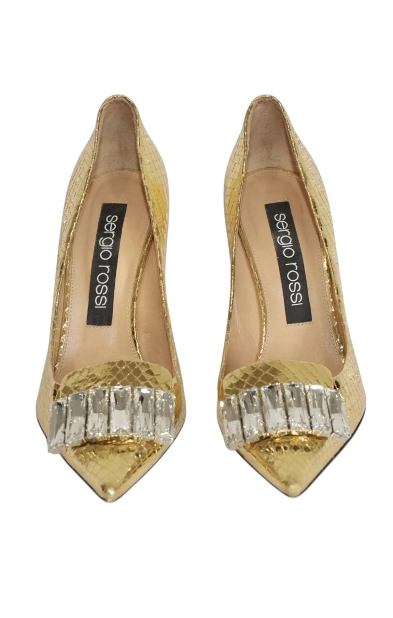 Pășește în lumea luxului cu acești pantofi stiletto spectaculoși de la Sergio Rossi, realizați din piele aurie cu textură python emboss pentru un finisaj opulent și îndrăzneț. Vârful ascuțit este decorat cu cristale transparente de mari dimensiuni, adăugând o notă strălucitoare acestei siluete sofisticate.