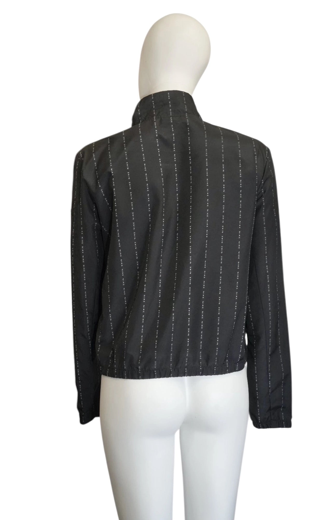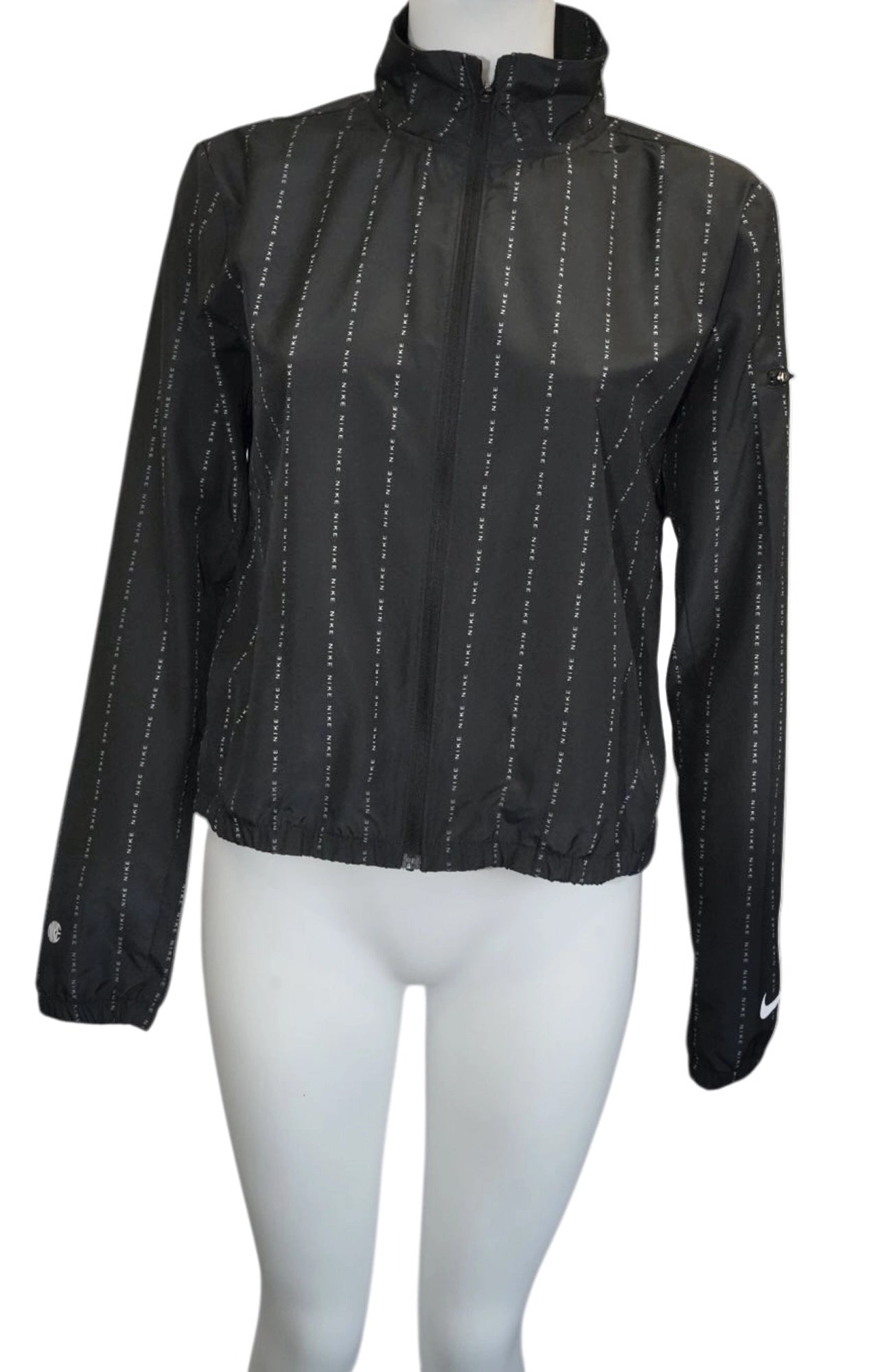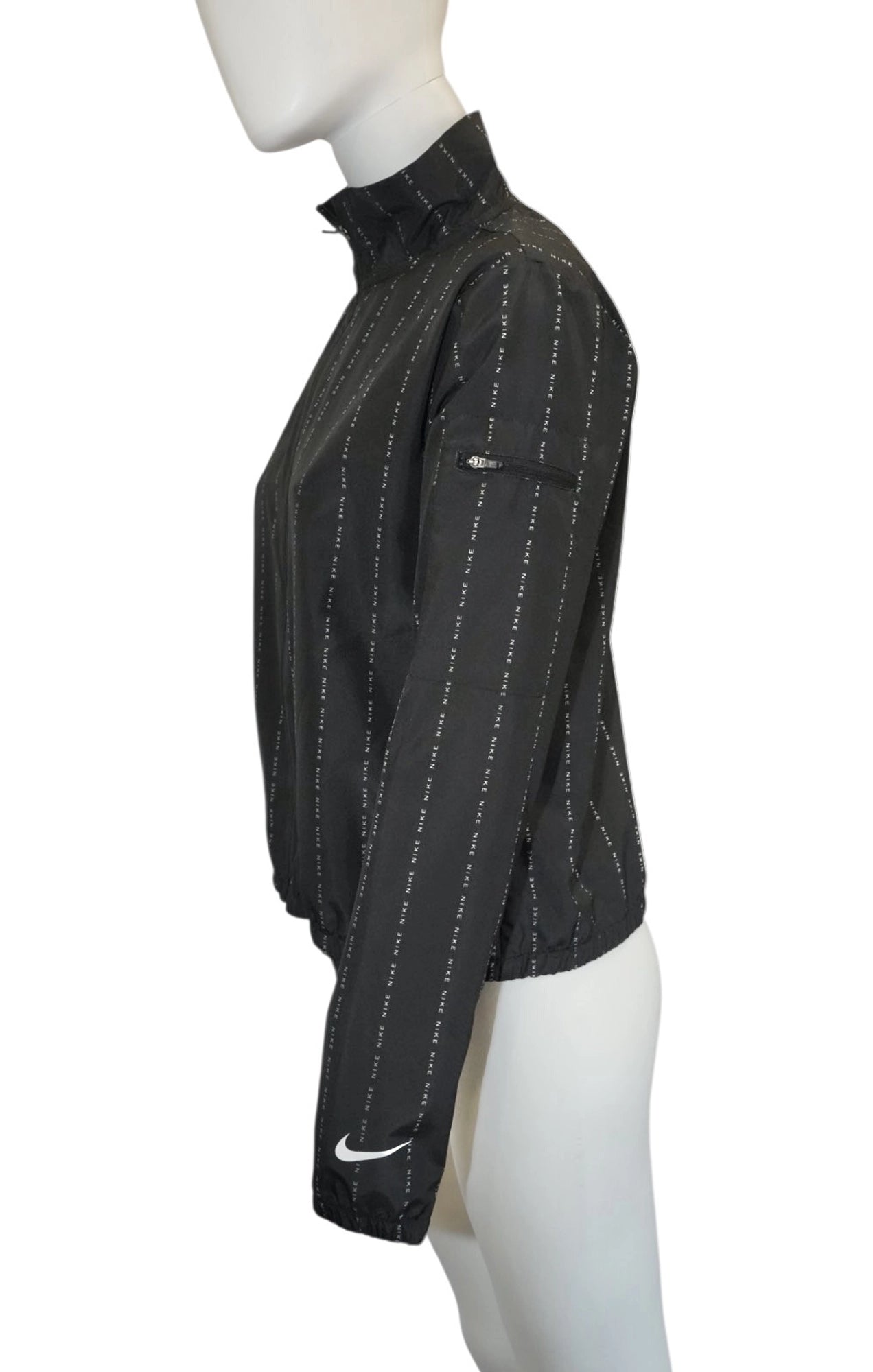 Sporty and versatile, this Nike women’s jacket in size S is crafted from lightweight polyester, making it perfect for workouts, running, or casual wear. The sleek black design is enhanced with reflective vertical stripes for added visibility in low light. Featuring a high collar, full zip closure, elastic hem, and cuffs, it ensures comfort and functionality. Subtle Nike logo details on the sleeve complete the sporty look.