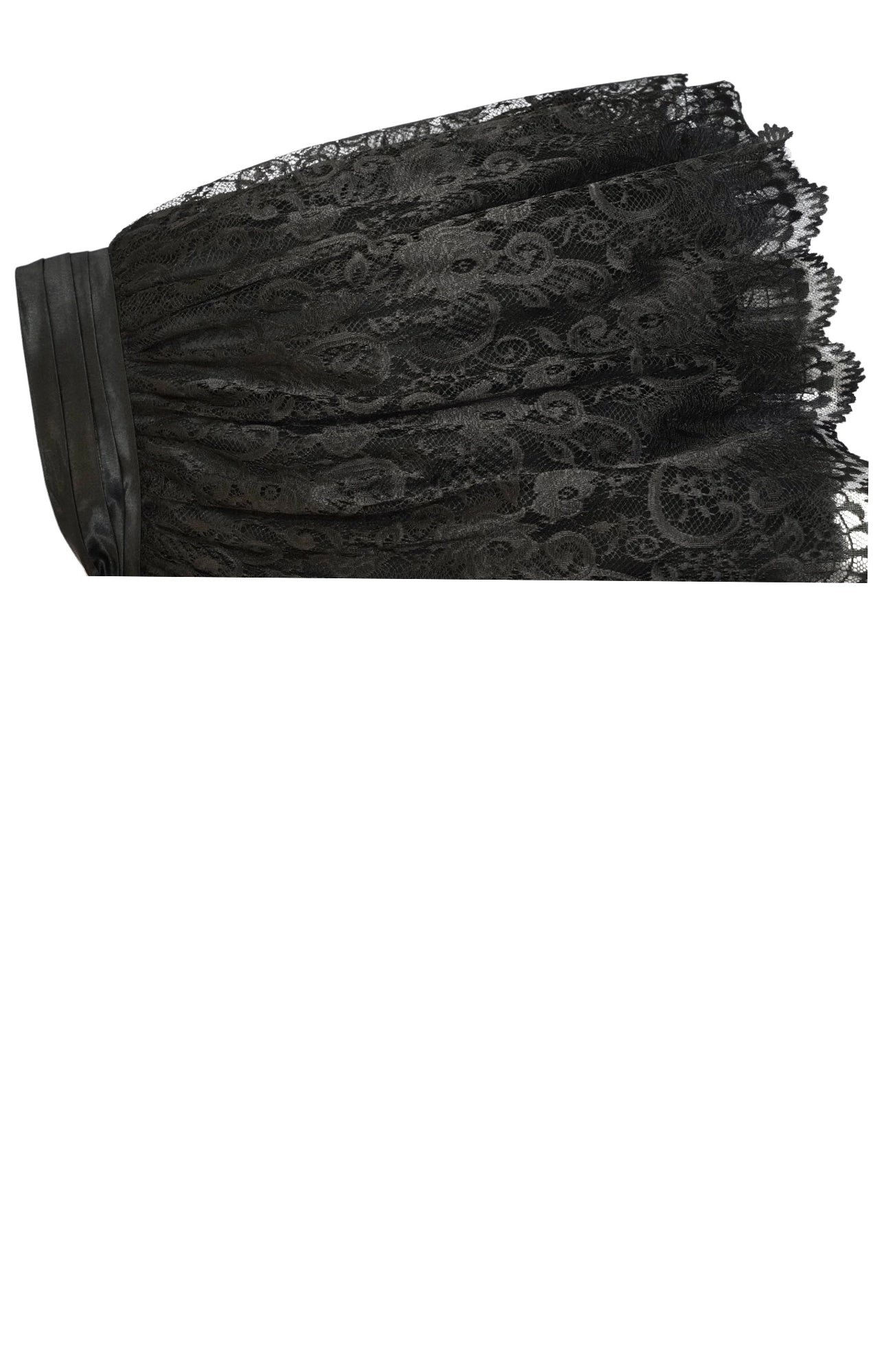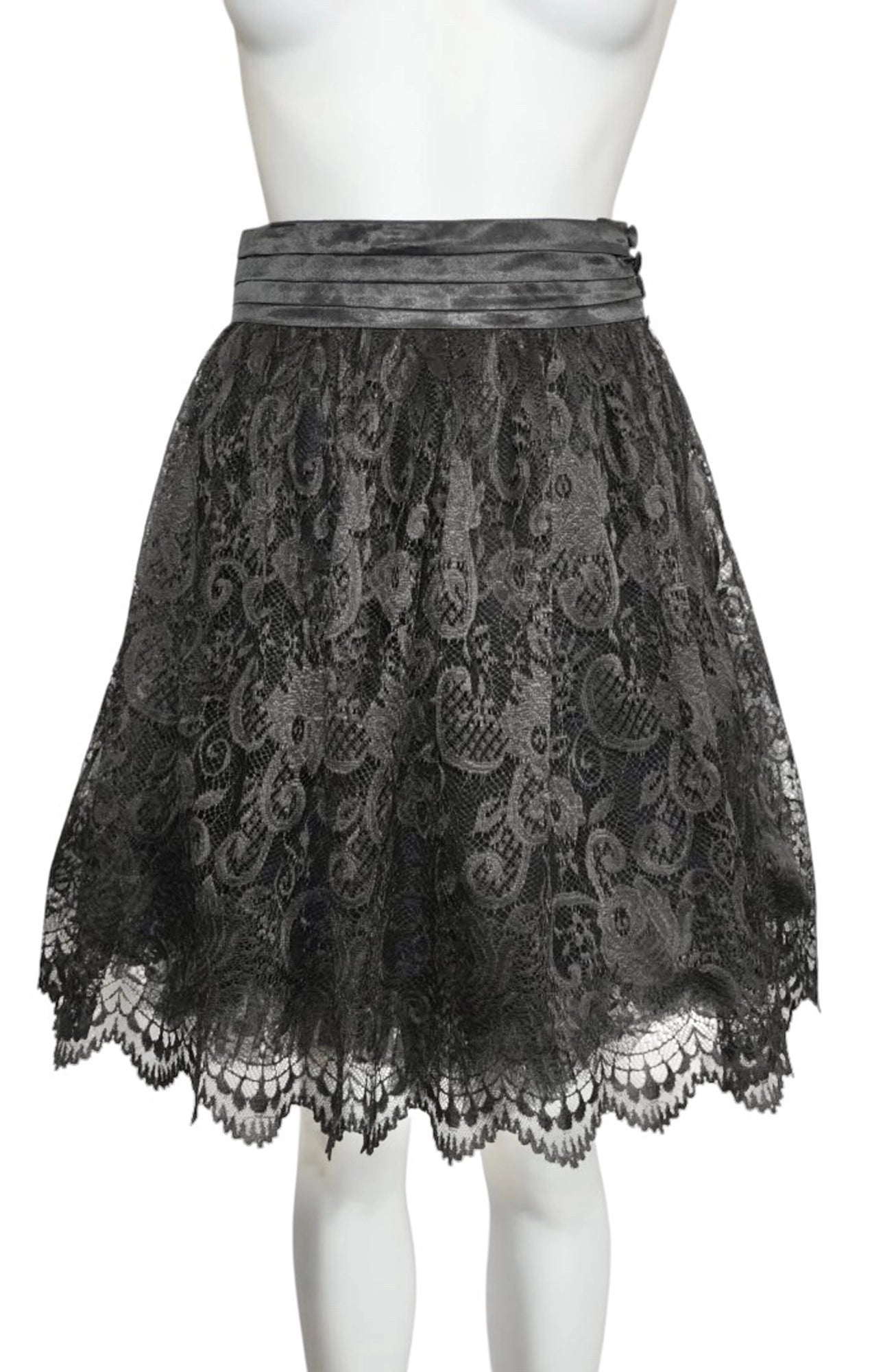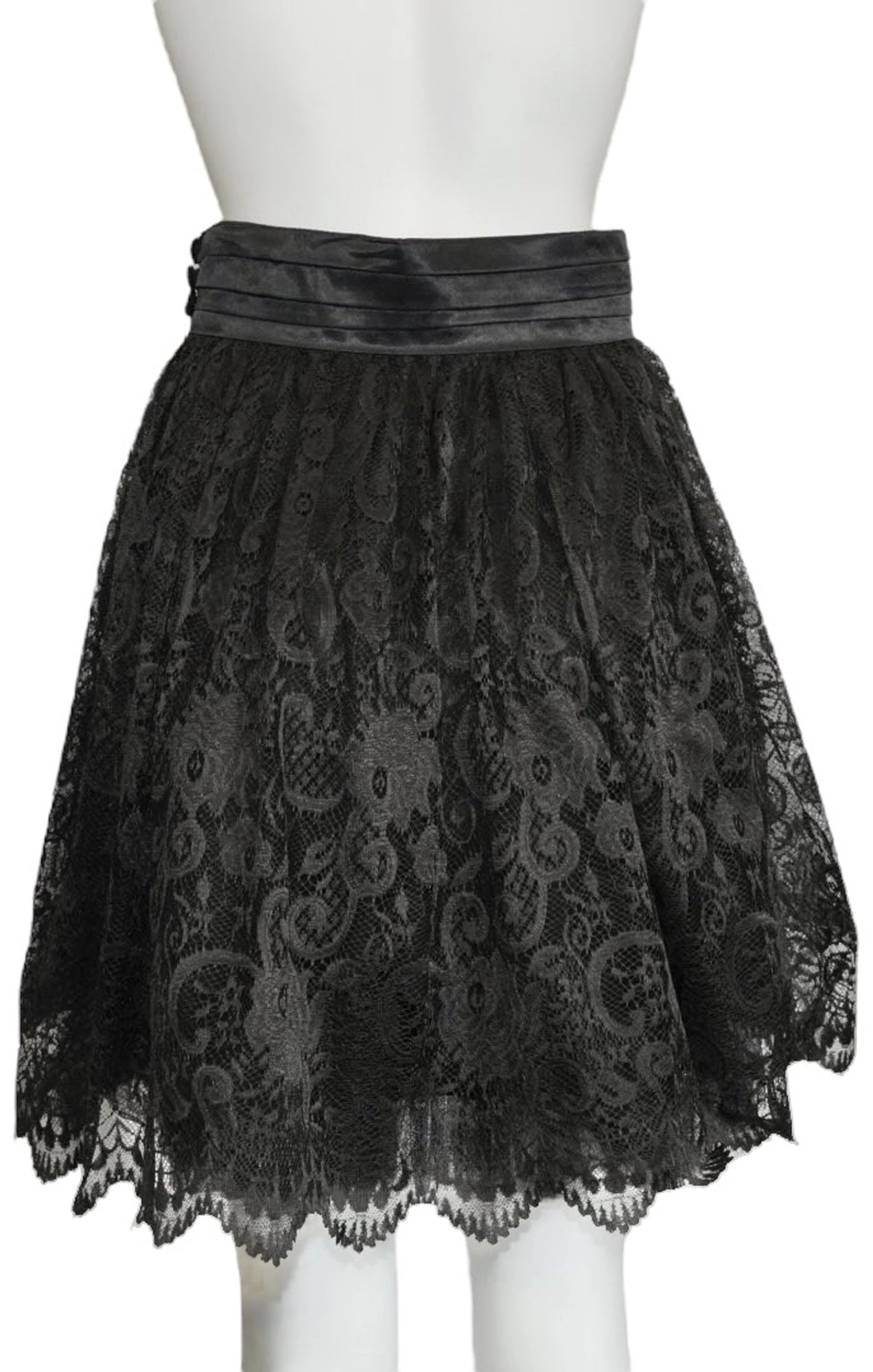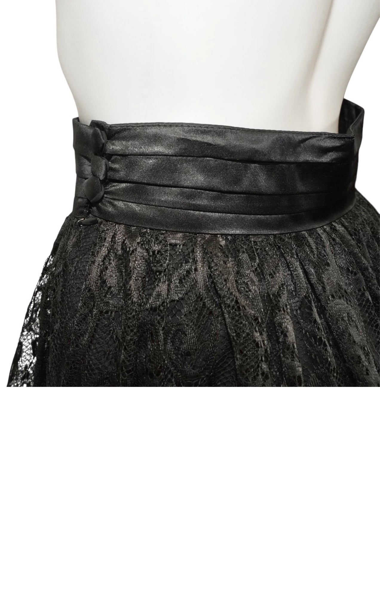 Elegant and feminine, this Cristina Nichita skirt is crafted from sophisticated black lace in a flared silhouette that adds volume and ease. The high waist is accentuated with pleated satin detailing, while the scalloped lace hem enhances its refined charm. Perfect for special occasions or a chic evening look.