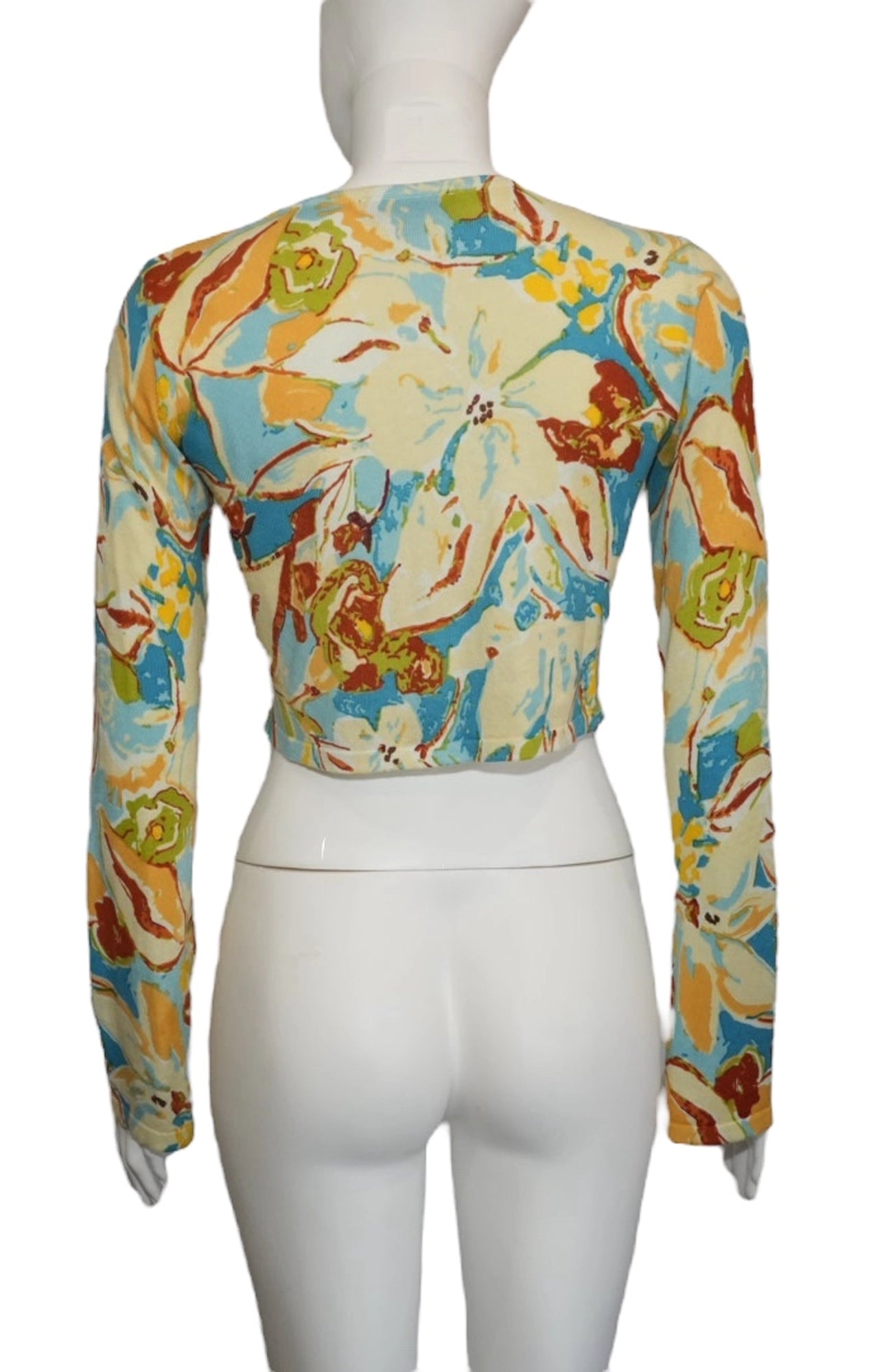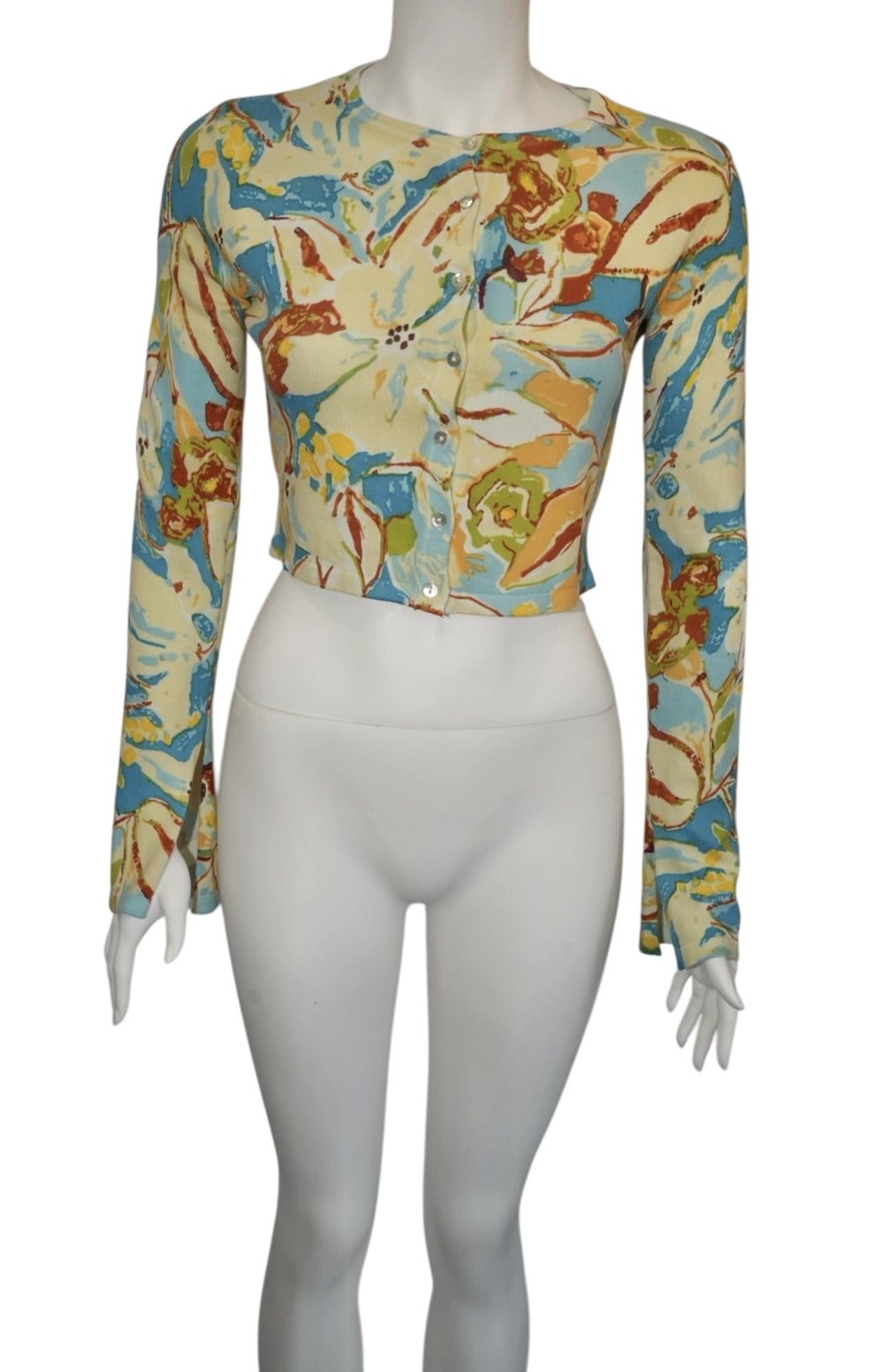 Chic and playful, this Zara cropped blouse in size S features a vibrant abstract floral print in shades of blue, yellow, green, and red. Designed with long sleeves, front button closure, and a slightly fitted silhouette, it offers a fresh and modern touch to any outfit. The cropped cut makes it ideal to pair with high-waisted jeans, skirts, or tailored trousers, perfect for casual days or stylish evenings out.