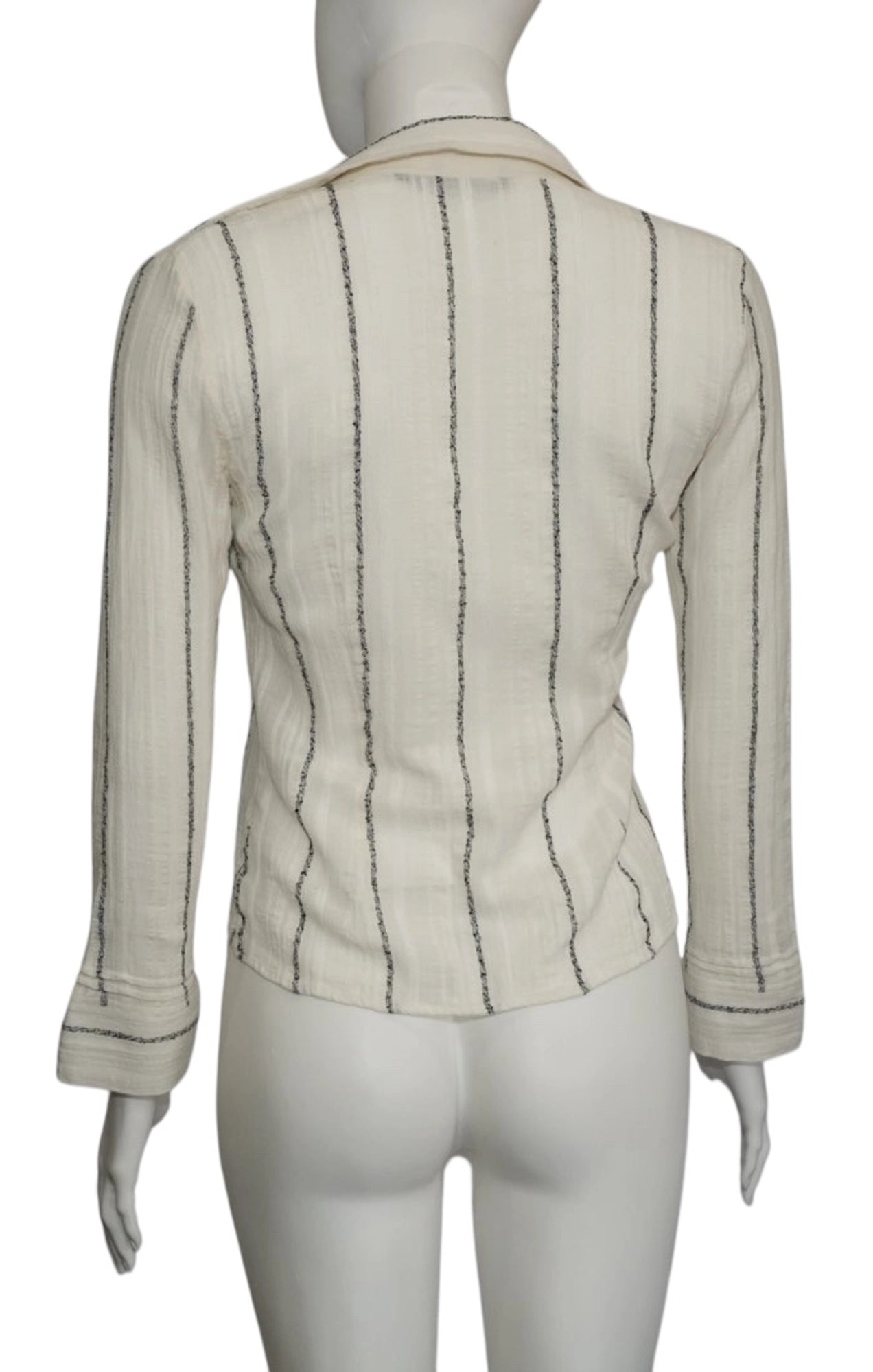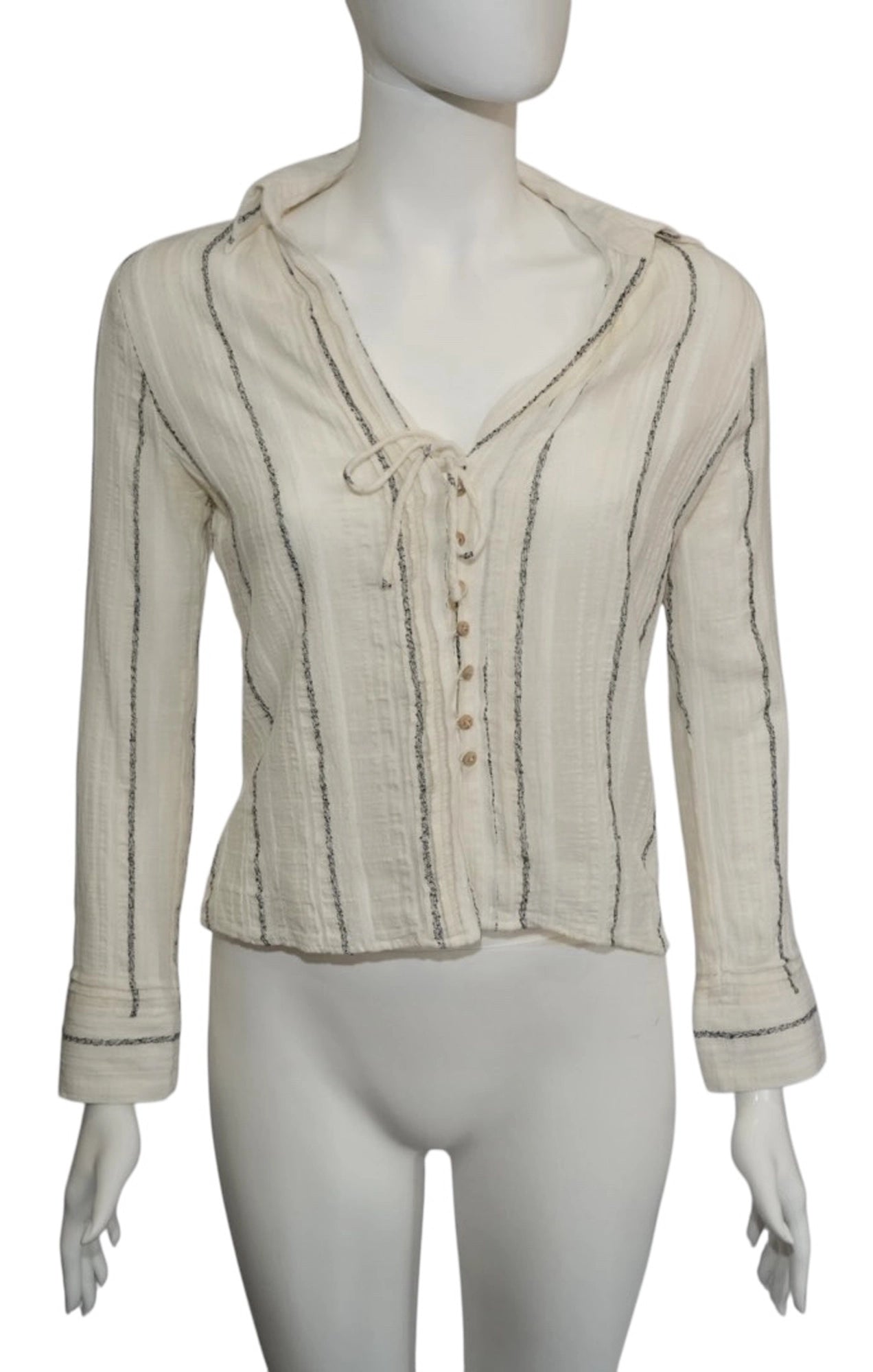 A chic Zara blouse in size S, designed in a cream shade with vertical contrasting stripes that elongate the silhouette. It features a V-neckline with tie detail, button-up front, and long sleeves. The lightweight textured fabric makes it both stylish and comfortable, ideal for layering or wearing on its own.