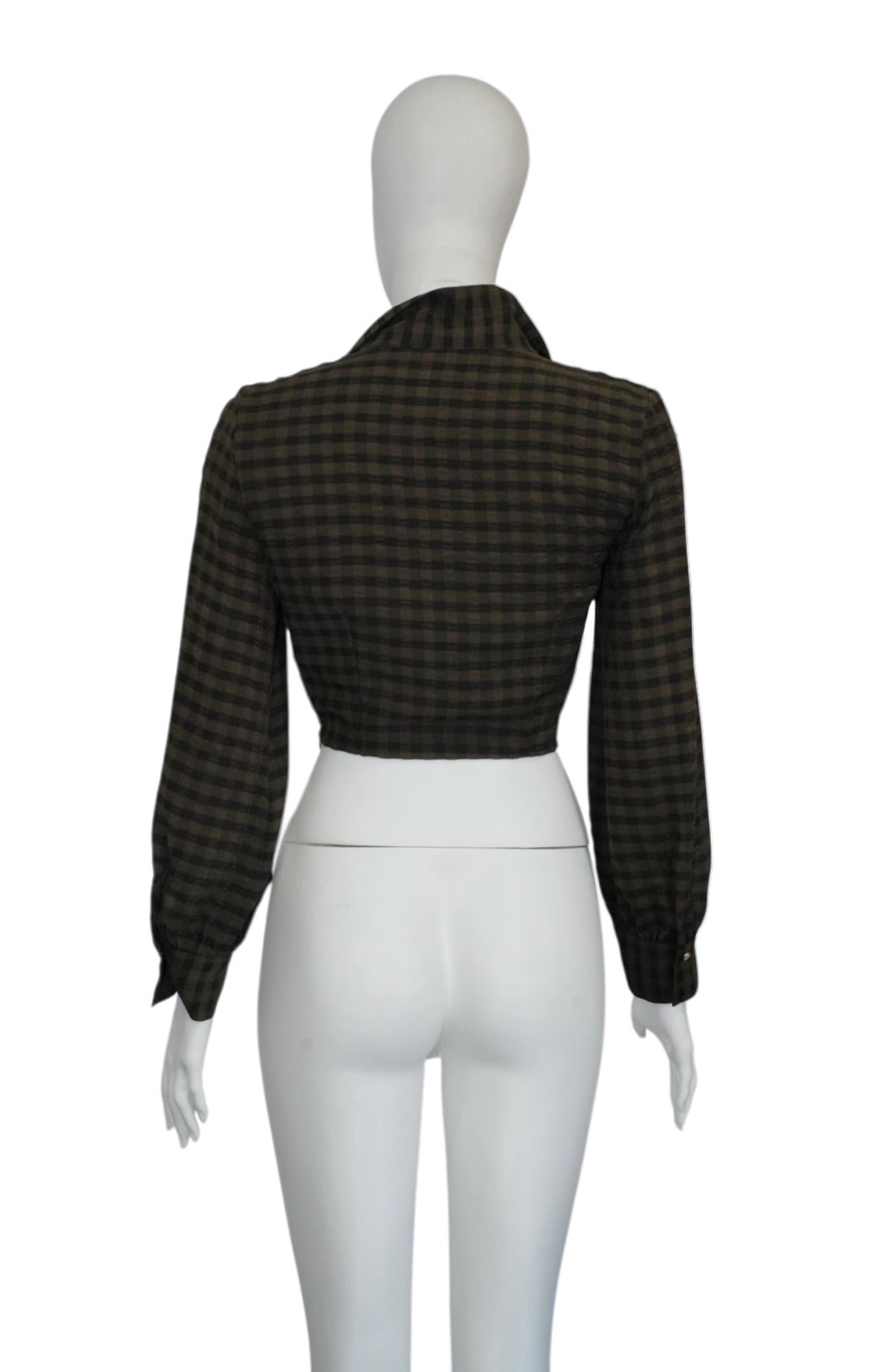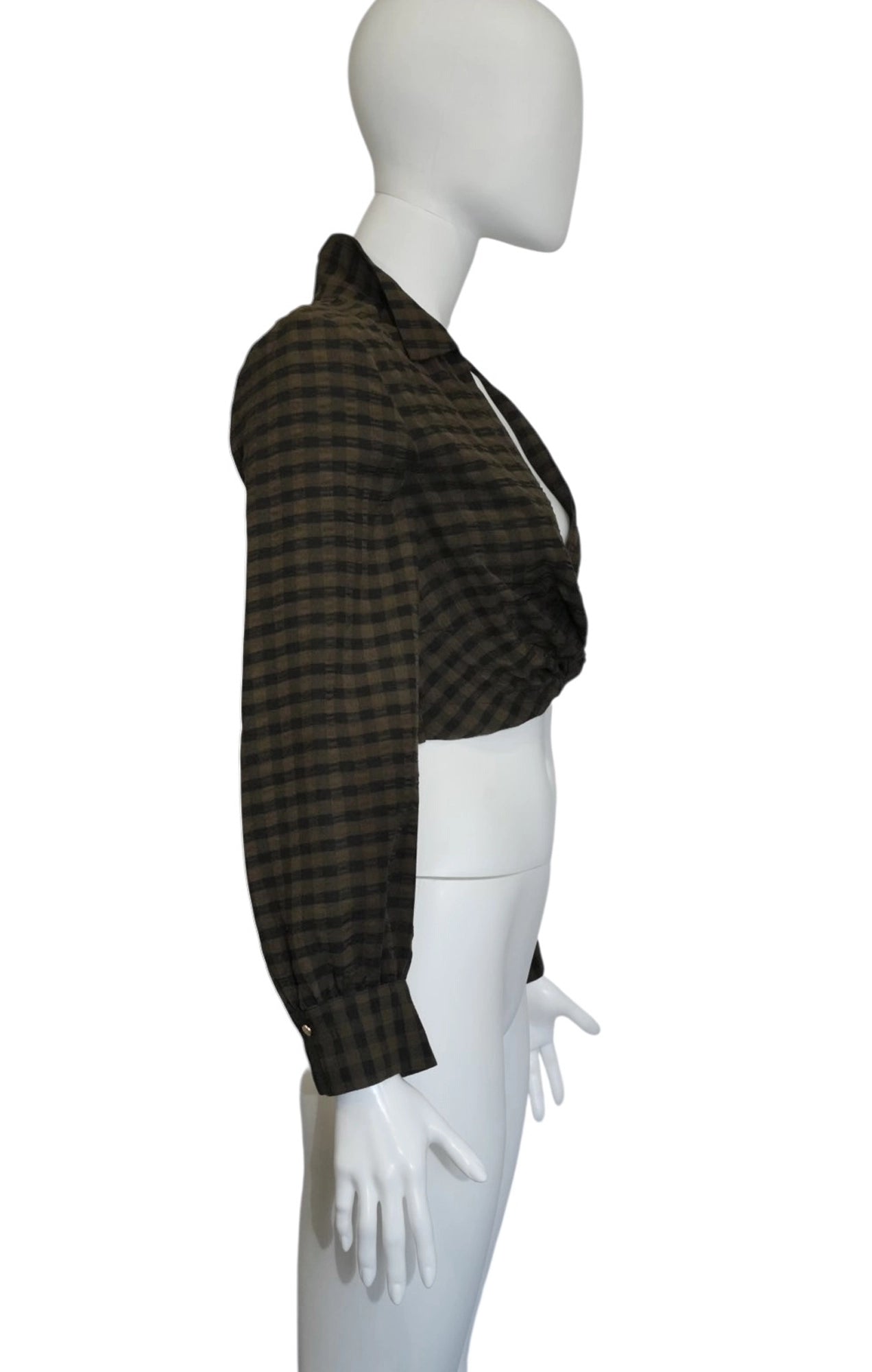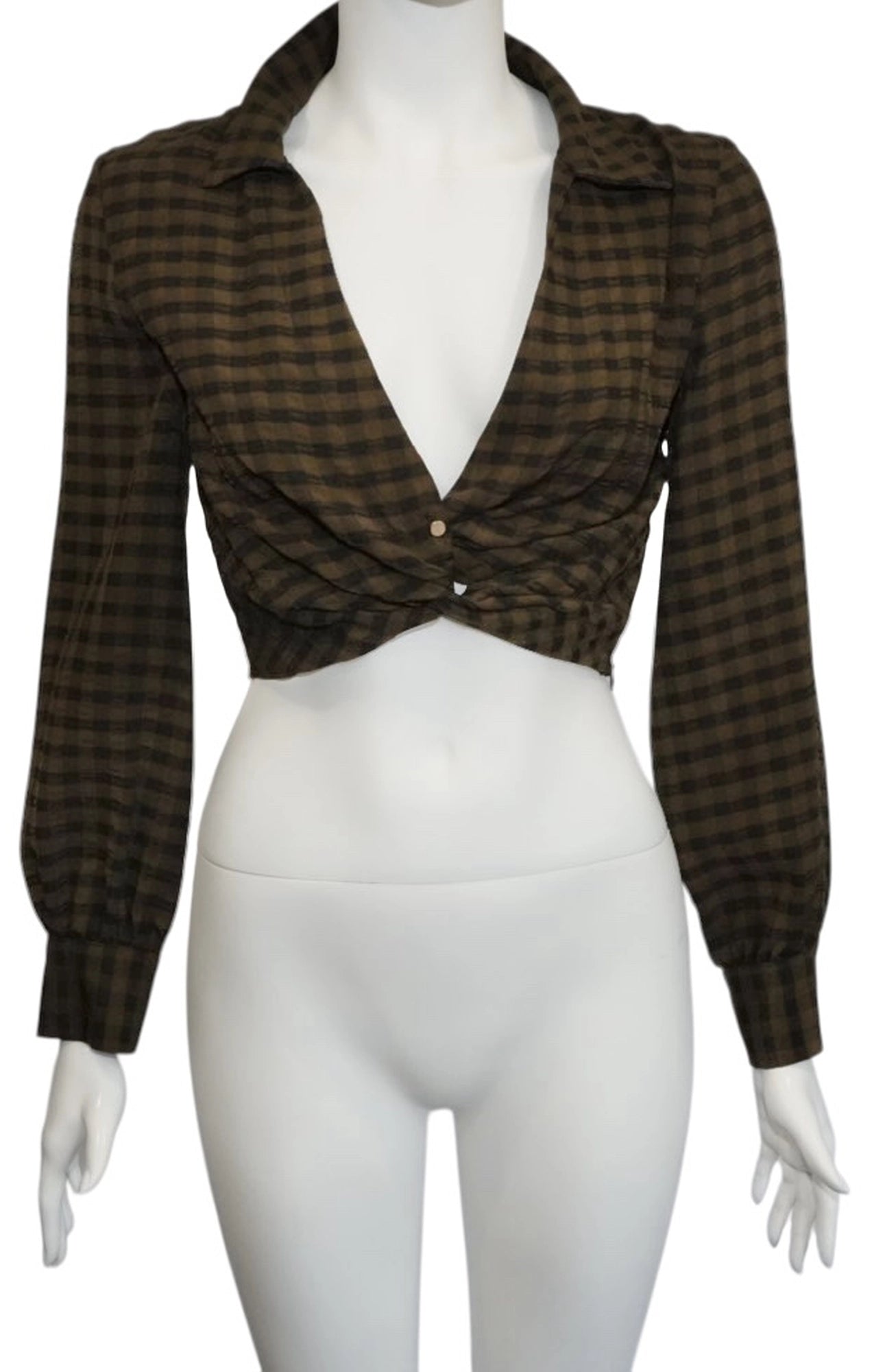 Trendy and flattering, this Zara cropped blouse in size S comes in a brown check pattern with a deep V-neckline and a stylish twist-front detail. Designed with long sleeves and buttoned cuffs, it balances casual charm with a chic silhouette. The fitted cropped cut makes it a perfect match for high-waisted jeans, skirts, or tailored pants.