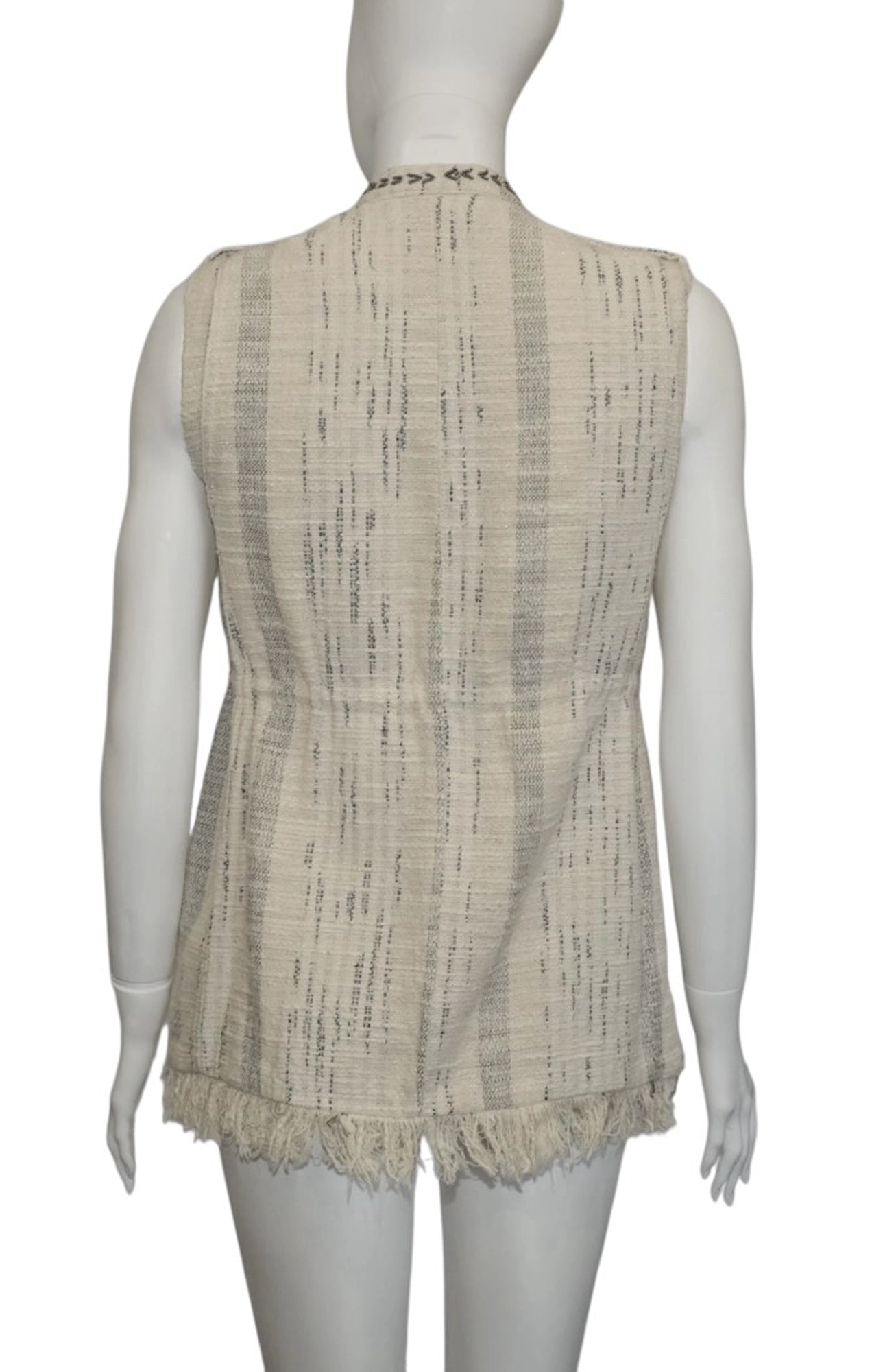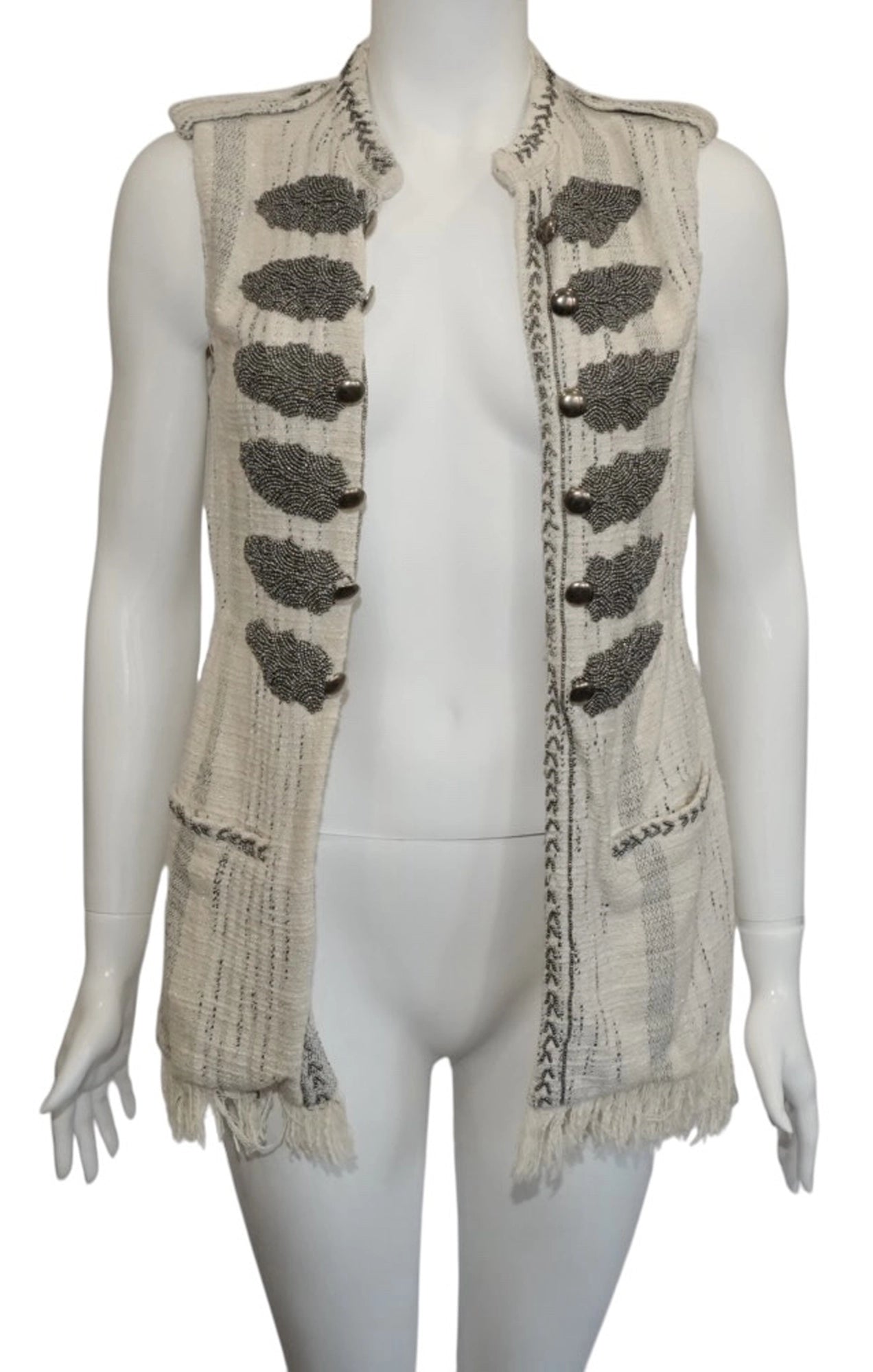 Chic and versatile, this Zara vest in size S features a military-inspired design with embroidered detailing and metallic button accents. Crafted in a neutral beige tone with textured fabric, it’s finished with fringed edges for a boho touch. The sleeveless cut makes it a perfect layering piece over blouses, dresses, or casual tops, adding character and style to any outfit.