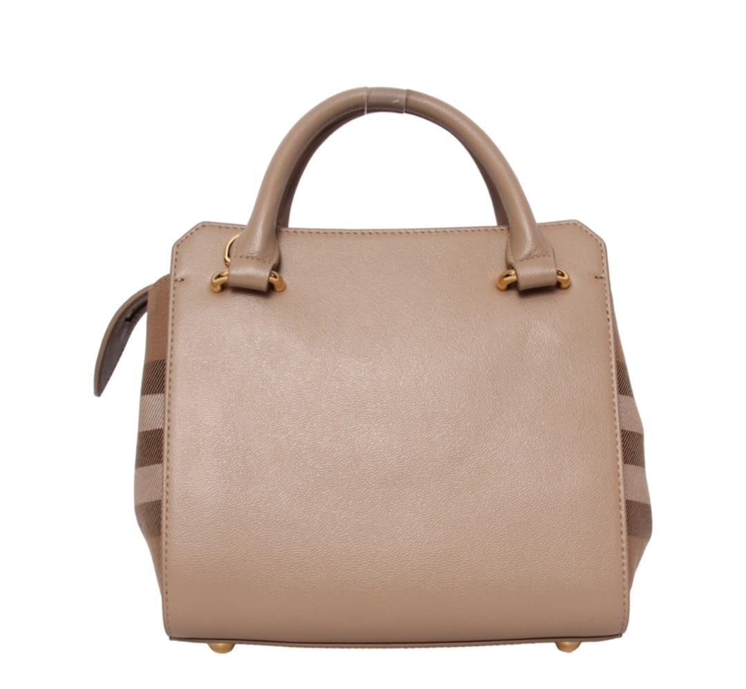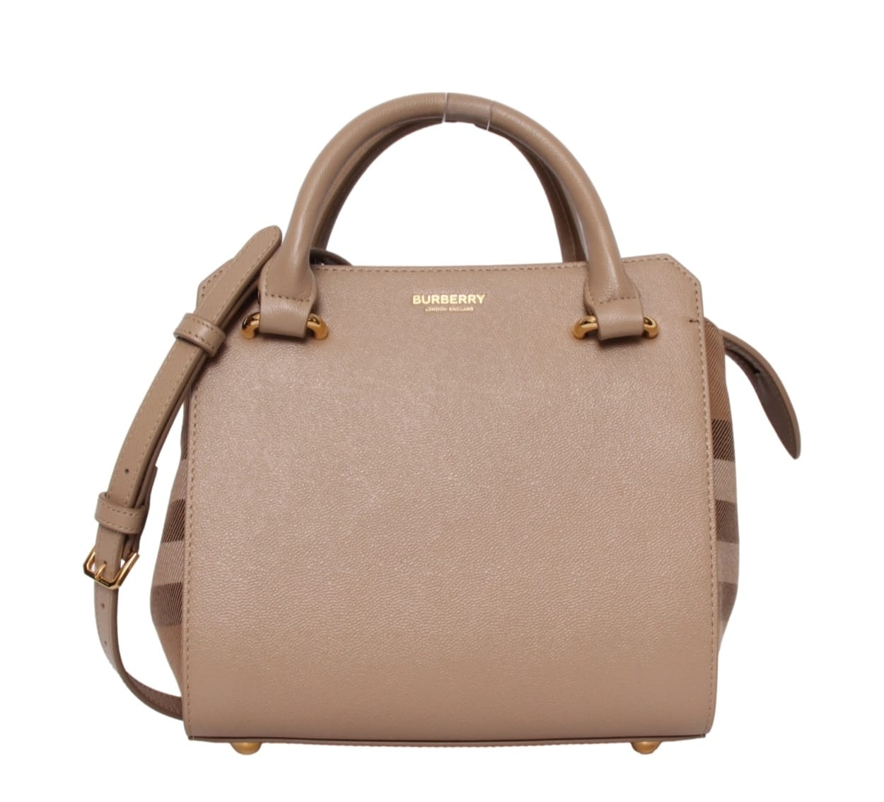 Materiale: Structura principală este realizată din piele granulată de culoare neutră (bej/taupe), oferind durabilitate și un aspect luxos. Părțile laterale sunt confecționate din material canvas cu modelul iconic în carouri, oferind un contrast vizual distinctiv.