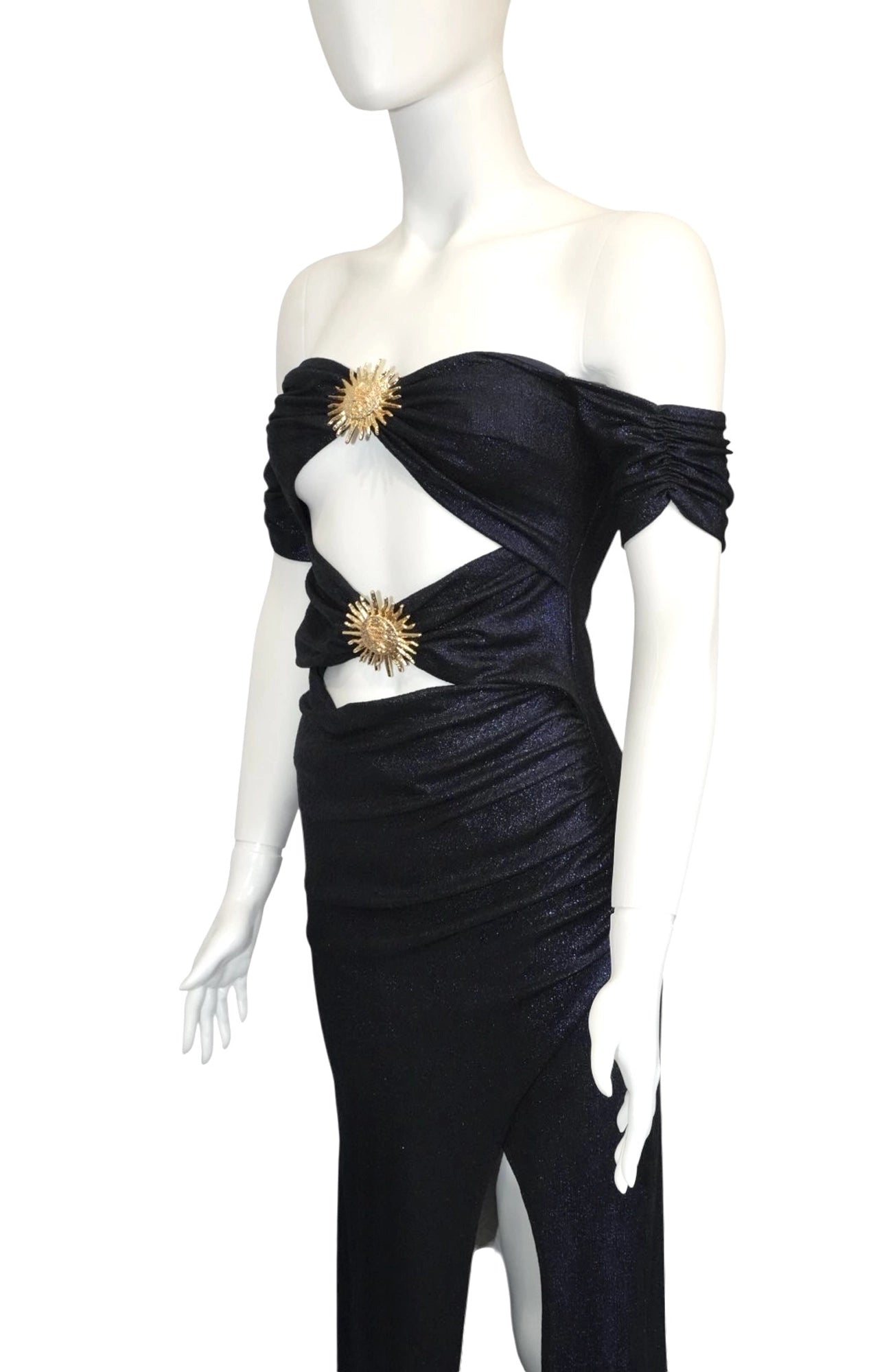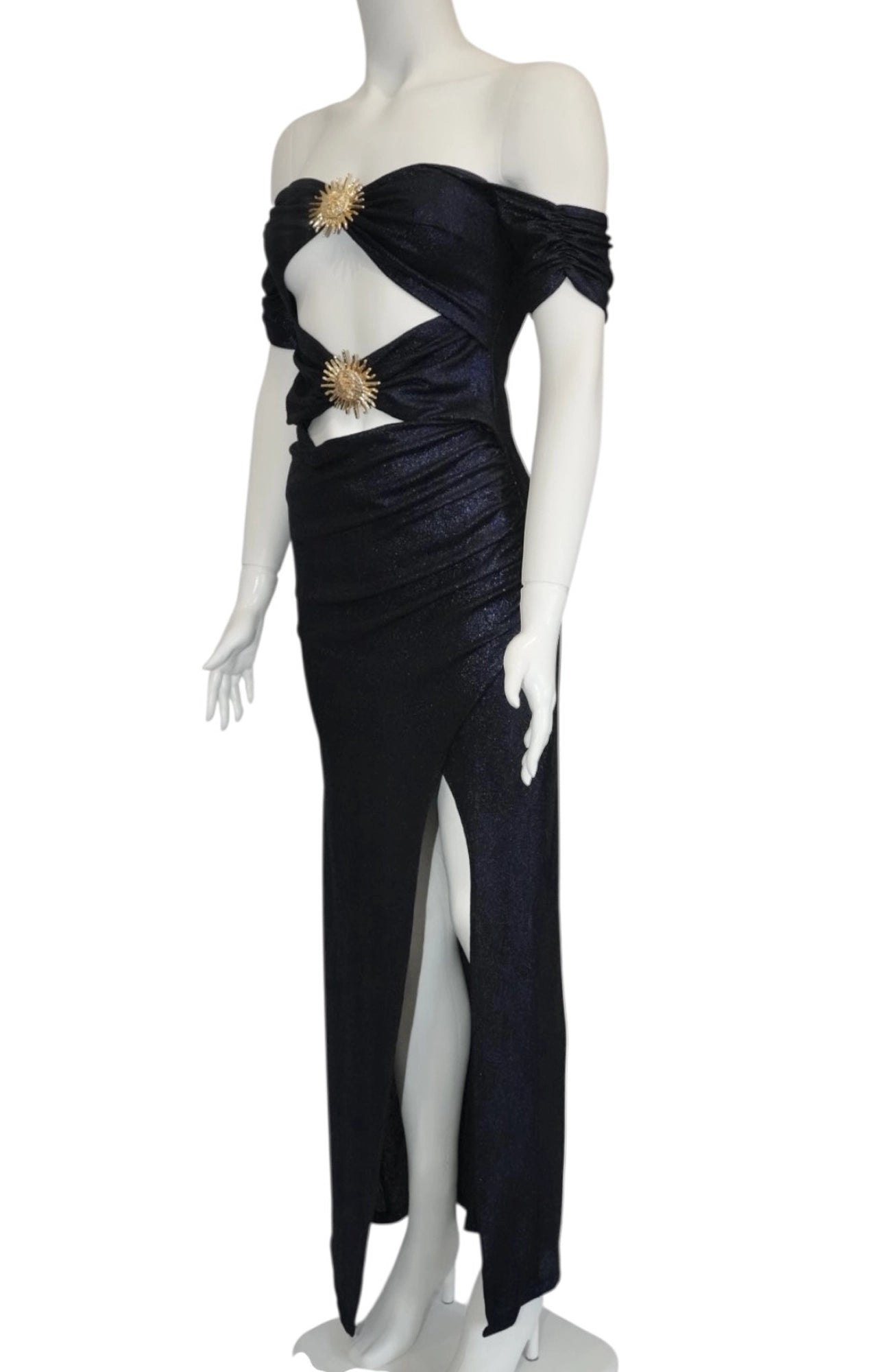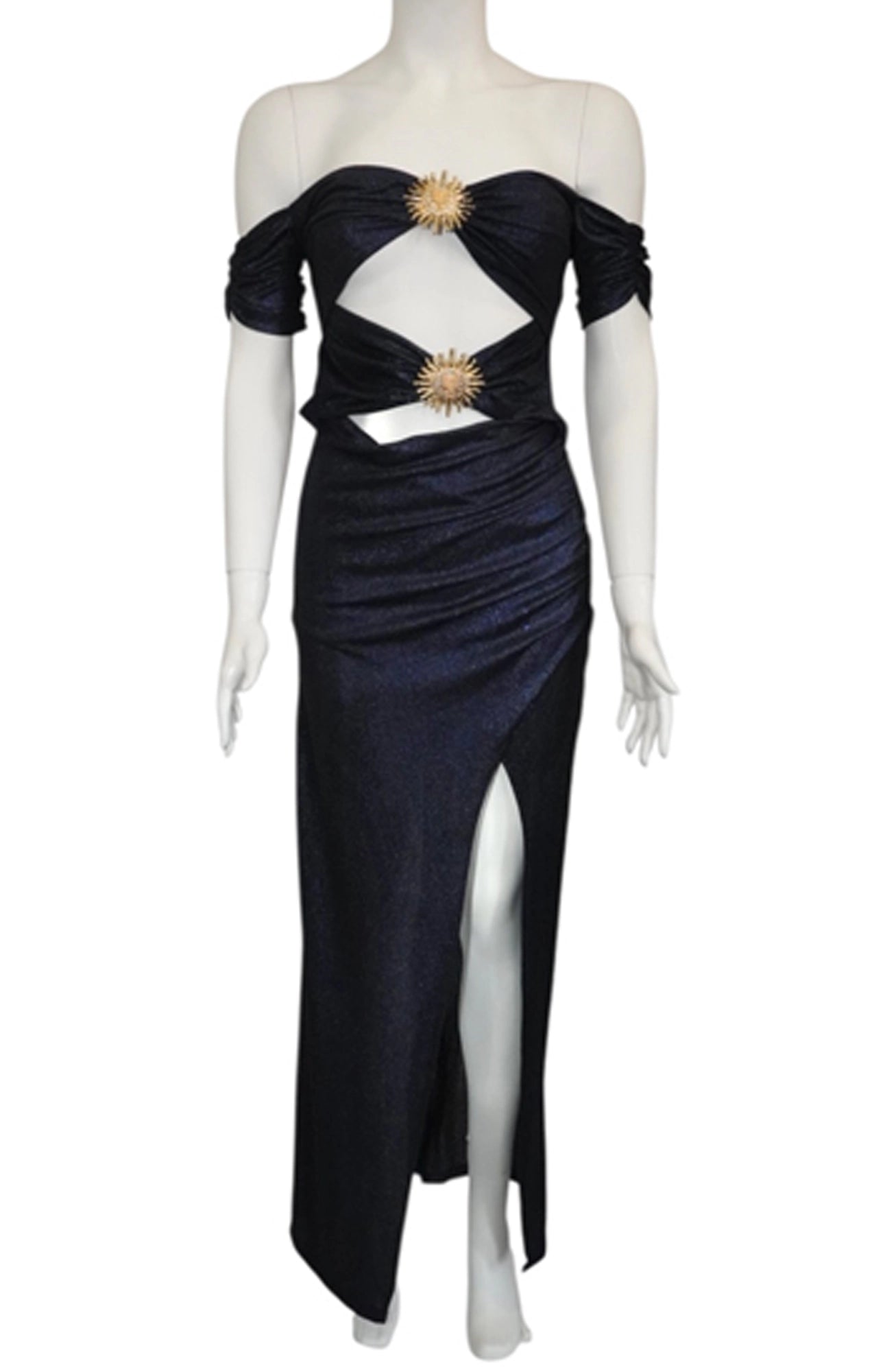 Features: Off-Shoulder Design, Cut-Out Front, Gold Sunburst Embellishments, Side Slit, Maxi Length